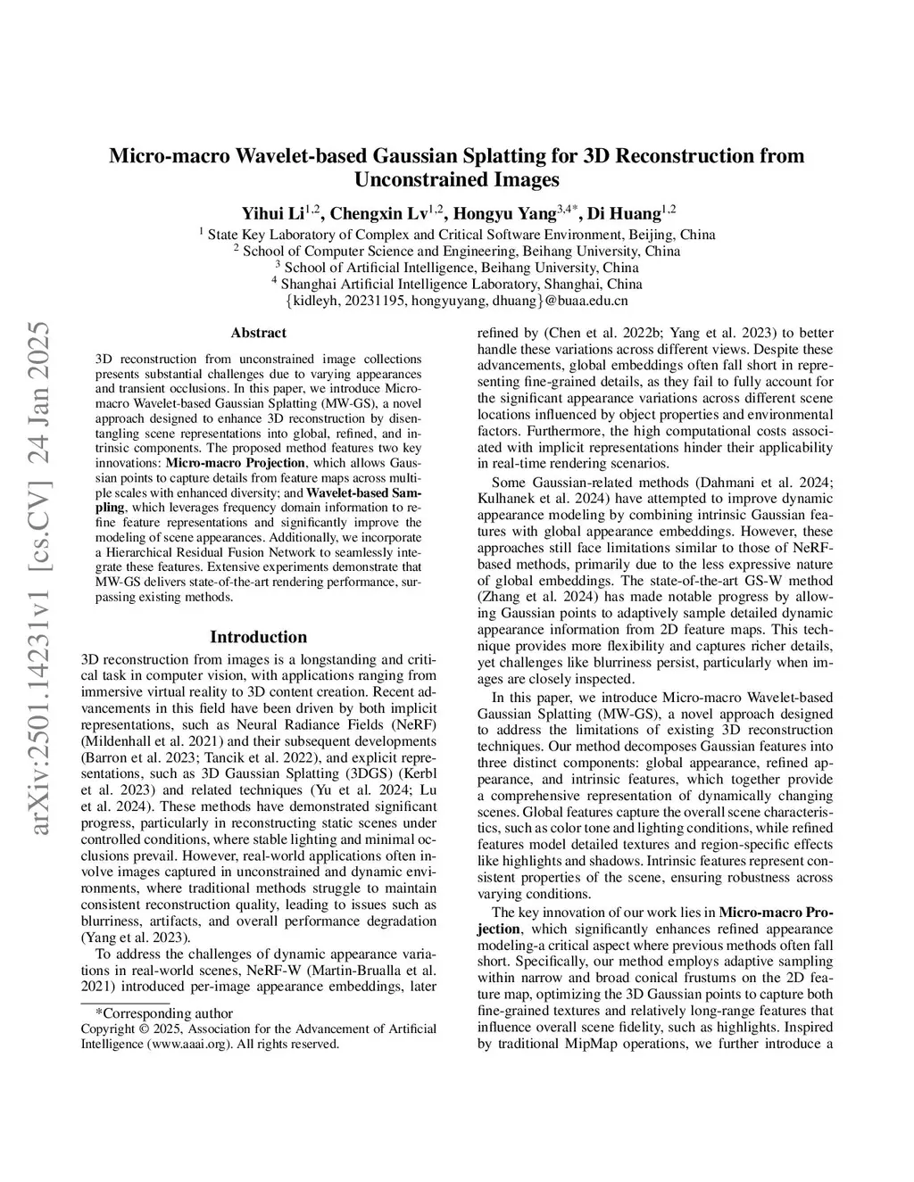Micro-macro Wavelet-based Gaussian Splatting for 3D Reconstruction from Unconstrained Images