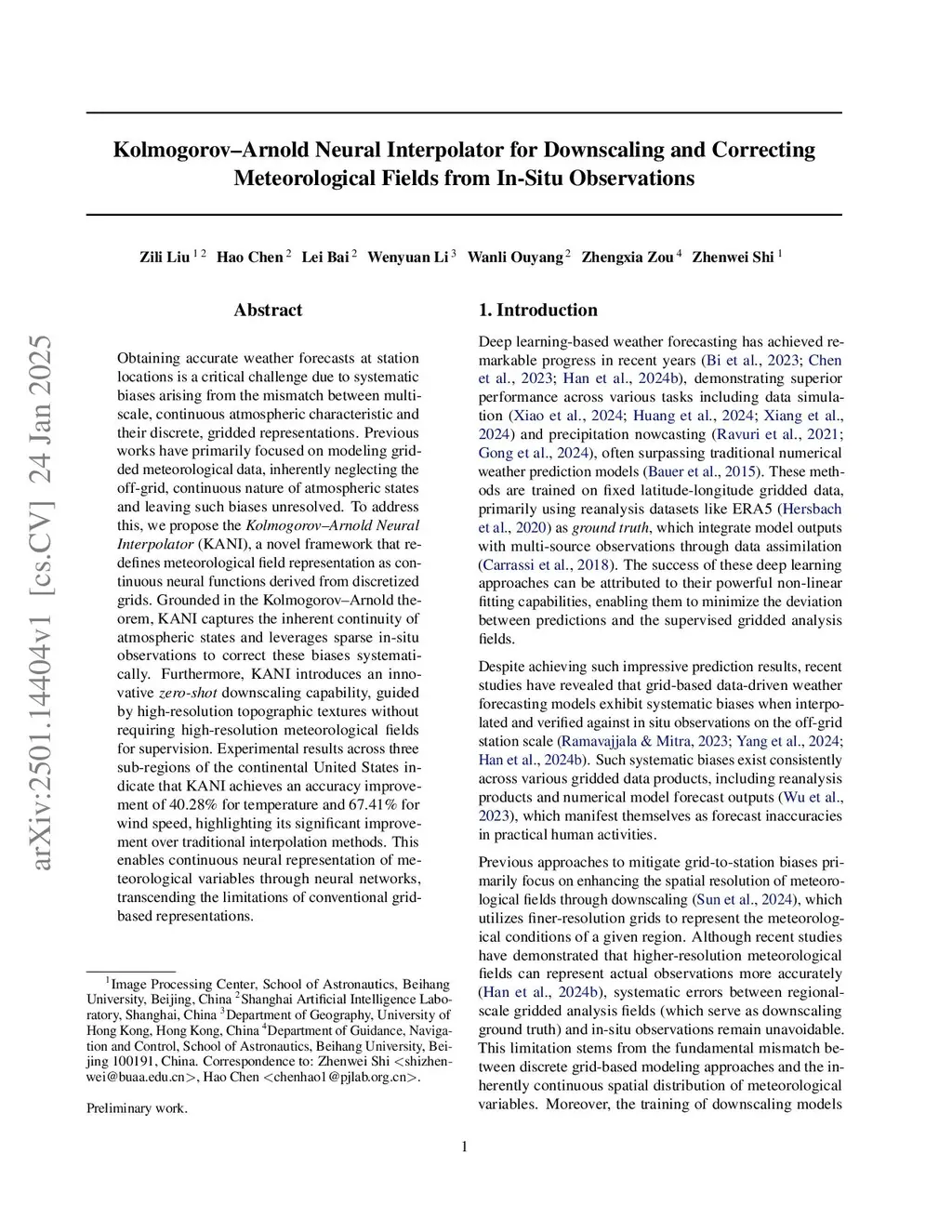 Obtaining accurate weather forecasts at station locations is a critical challenge due to systematic biases arising from the mismatch between multi-scale, continuous atmospheric characteristic and their discrete, gridded representations. Previous works have primarily focused on modeling gridded meteorological data, inherently neglecting the off-grid, continuous nature of atmospheric states and leaving such biases unresolved. To address this, we propose the Kolmogorov Arnold Neural Interpolator (KANI), a novel framework that redefines meteorological field representation as continuous neural functions derived from discretized grids. Grounded in the Kolmogorov Arnold theorem, KANI captures the inherent continuity of atmospheric states and leverages sparse in-situ observations to correct these biases systematically. Furthermore, KANI introduces an innovative zero-shot downscaling capability, guided by high-resolution topographic textures without requiring high-resolution meteorological fields for supervision. Experimental results across three sub-regions of the continental United States indicate that KANI achieves an accuracy improvement of 40.28% for temperature and 67.41% for wind speed, highlighting its significant improvement over traditional interpolation methods. This enables continuous neural representation of meteorological variables through neural networks, transcending the limitations of conventional grid-based representations.