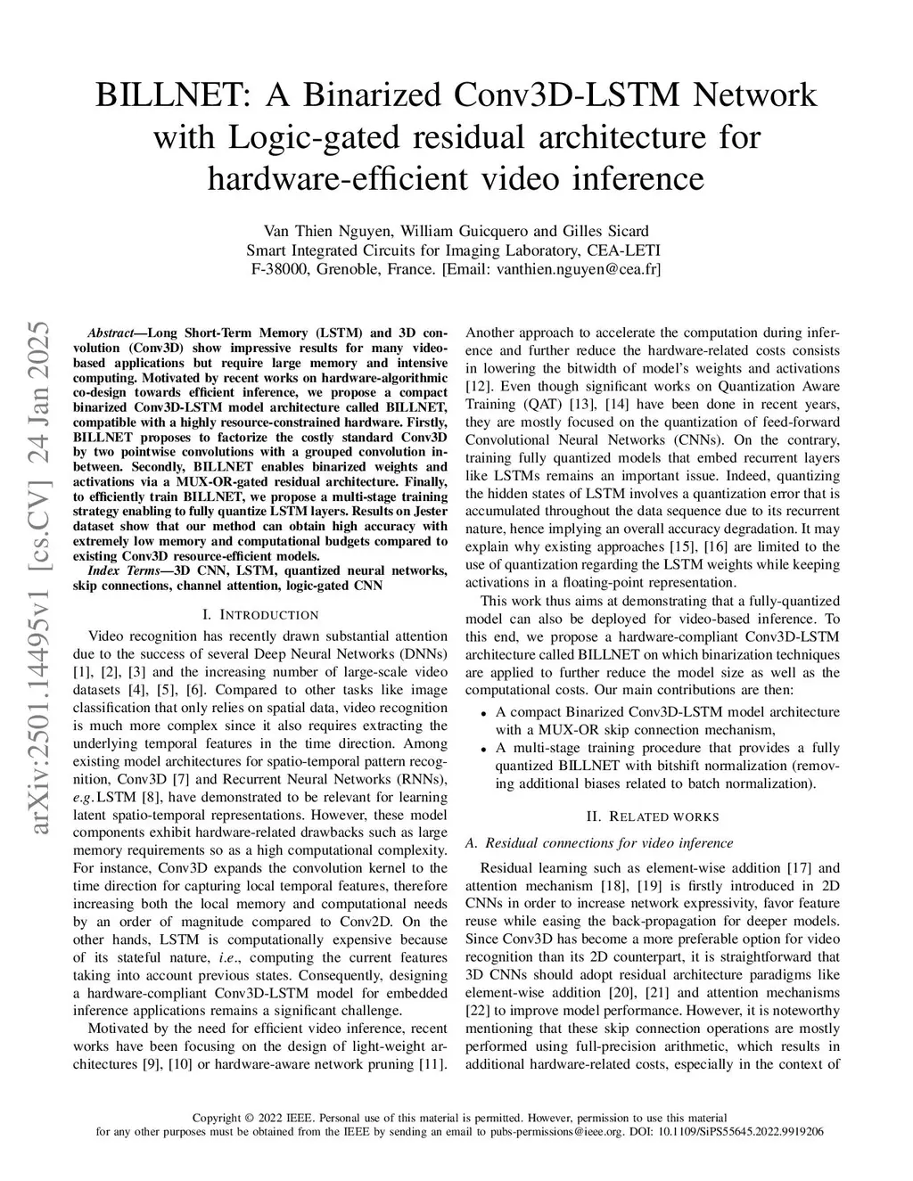 BILLNET: A Binarized Conv3D-LSTM Network with Logic-gated residual architecture for hardware-efficient video inference