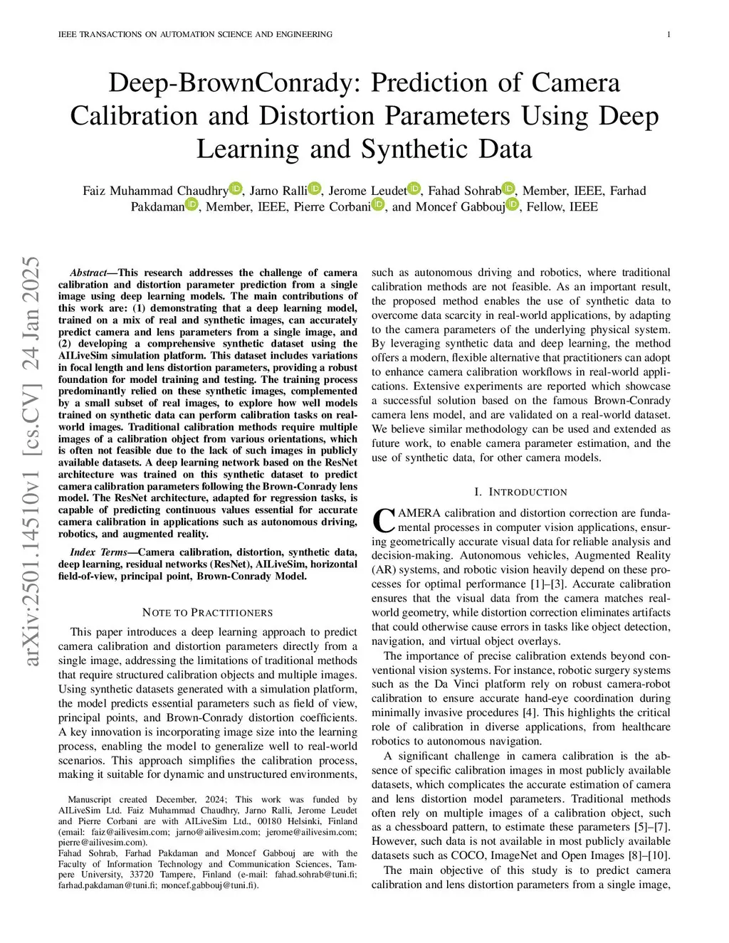 Deep-BrownConrady: Prediction of Camera Calibration and Distortion Parameters Using Deep Learning and Synthetic Data