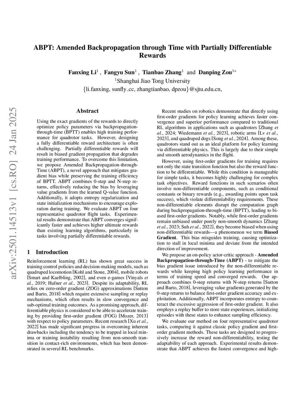 Quadrotor control policies can be trained with high performance using the exact gradients of the rewards to directly optimize policy parameters via backpropagation-through-time (BPTT). However, designing a fully differentiable reward architecture is often challenging. Partially differentiable rewards will result in biased gradient propagation that degrades training performance. To overcome this limitation, we propose Amended Backpropagation-through-Time (ABPT), a novel approach that mitigates gradient bias while preserving the training efficiency of BPTT. ABPT combines 0-step and N-step returns, effectively reducing the bias by leveraging value gradients from the learned Q-value function. Additionally, it adopts entropy regularization and state initialization mechanisms to encourage exploration during training. We evaluate ABPT on four representative quadrotor flight tasks \li{in both real world and simulation}. Experimental results demonstrate that ABPT converges significantly faster and achieves higher ultimate rewards than existing learning algorithms, particularly in tasks involving partially differentiable rewards. The code will be released atthis http URL.