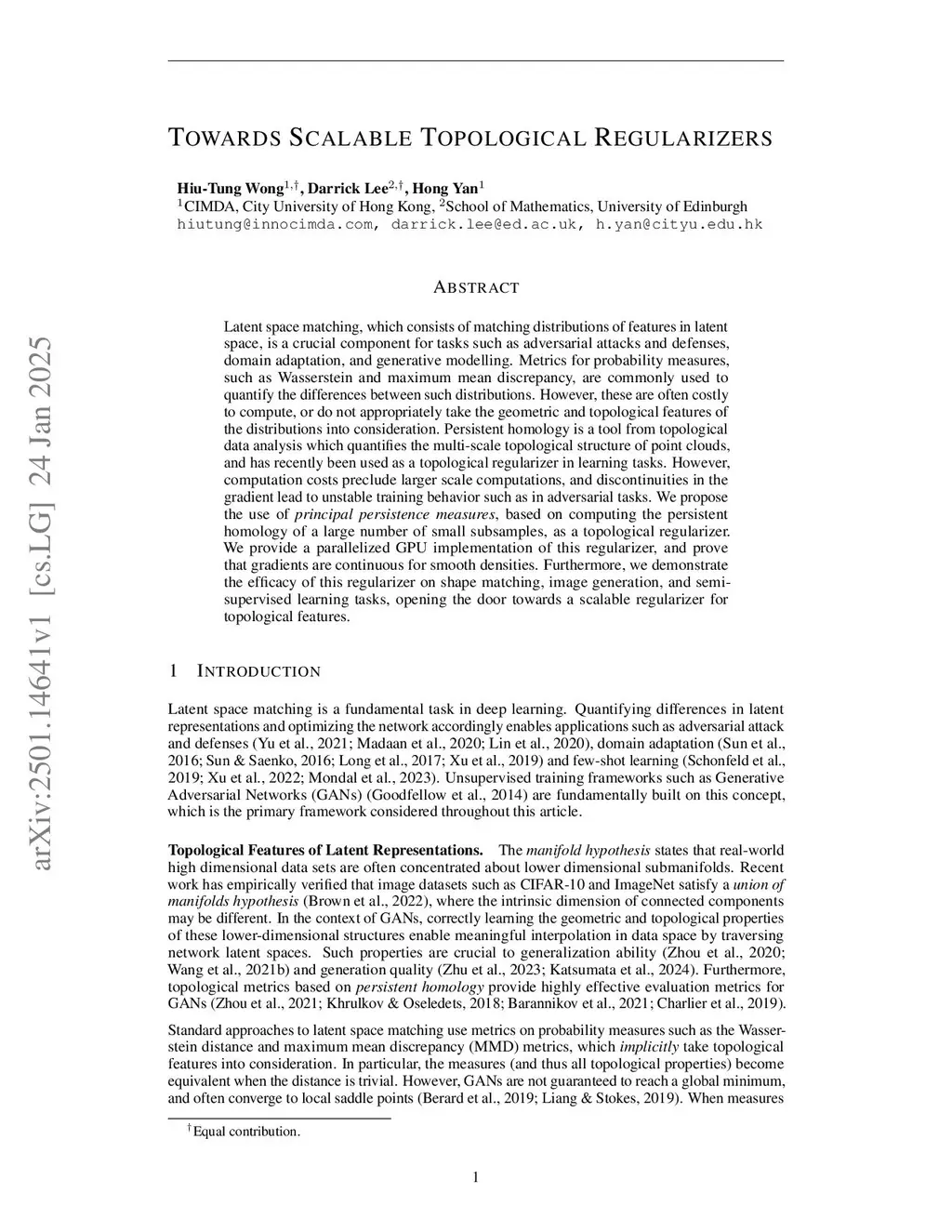 Latent space matching, which consists of matching distributions of features in latent space, is a crucial component for tasks such as adversarial attacks and defenses, domain adaptation, and generative modelling. Metrics for probability measures, such as Wasserstein and maximum mean discrepancy, are commonly used to quantify the differences between such distributions. However, these are often costly to compute, or do not appropriately take the geometric and topological features of the distributions into consideration. Persistent homology is a tool from topological data analysis which quantifies the multi-scale topological structure of point clouds, and has recently been used as a topological regularizer in learning tasks. However, computation costs preclude larger scale computations, and discontinuities in the gradient lead to unstable training behavior such as in adversarial tasks. We propose the use of principal persistence measures, based on computing the persistent homology of a large number of small subsamples, as a topological regularizer. We provide a parallelized GPU implementation of this regularizer, and prove that gradients are continuous for smooth densities. Furthermore, we demonstrate the efficacy of this regularizer on shape matching, image generation, and semi-supervised learning tasks, opening the door towards a scalable regularizer for topological features.