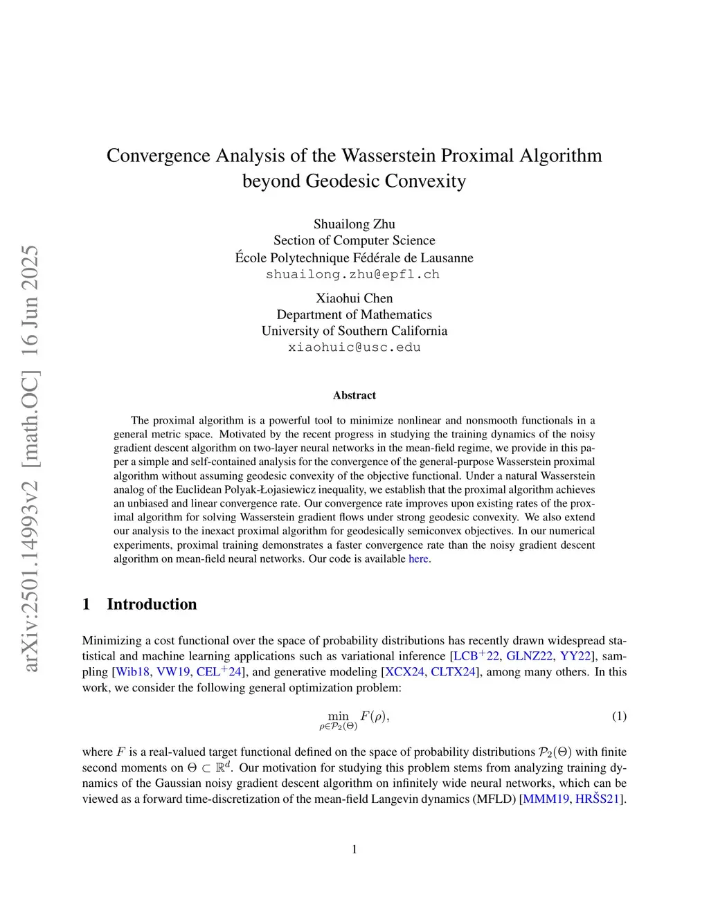 The proximal algorithm is a powerful tool to minimize nonlinear and nonsmooth functionals in a general metric space. Motivated by the recent progress in studying the training dynamics of the noisy gradient descent algorithm on two-layer neural networks in the mean-field regime, we provide in this paper a simple and self-contained analysis for the convergence of the general-purpose Wasserstein proximal algorithm without assuming geodesic convexity of the objective functional. Under a natural Wasserstein analog of the Euclidean Polyak-Łojasiewicz inequality, we establish that the proximal algorithm achieves an unbiased and linear convergence rate. Our convergence rate improves upon existing rates of the proximal algorithm for solving Wasserstein gradient flows under strong geodesic convexity. We also extend our analysis to the inexact proximal algorithm for geodesically semiconvex objectives. In our numerical experiments, proximal training demonstrates a faster convergence rate than the noisy gradient descent algorithm on mean-field neural networks.