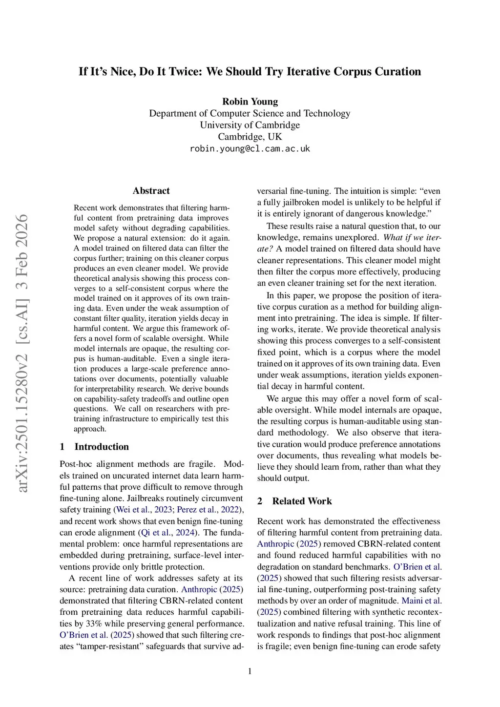 Recent work demonstrates that filtering harmful content from pretraining data improves model safety without degrading capabilities. We propose a natural extension: do it again. A model trained on filtered data can filter the corpus further; training on this cleaner corpus produces an even cleaner model. We provide theoretical analysis showing this process converges to a self-consistent corpus where the model trained on it approves of its own training data. Even under the weak assumption of constant filter quality, iteration yields decay in harmful content. We argue this framework offers a novel form of scalable oversight. While model internals are opaque, the resulting corpus is human-auditable. Even a single iteration produces a large-scale preference annotations over documents, potentially valuable for interpretability research. We derive bounds on capability-safety tradeoffs and outline open questions. We call on researchers with pretraining infrastructure to empirically test this approach.