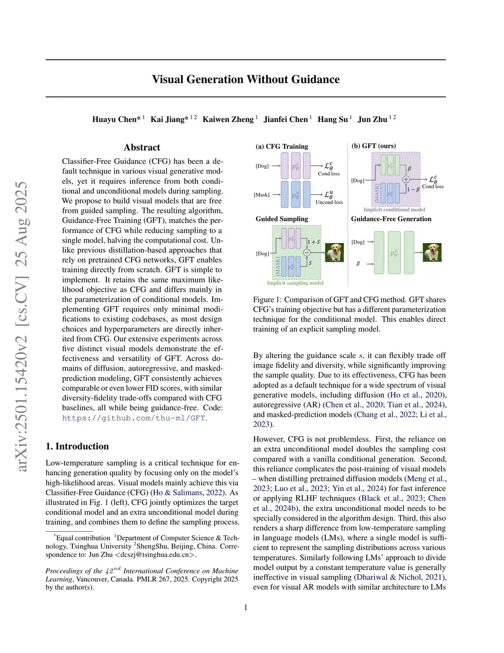 Classifier-Free Guidance (CFG) has been a default technique in various visual generative models, yet it requires inference from both conditional and unconditional models during sampling. We propose to build visual models that are free from guided sampling. The resulting algorithm, Guidance-Free Training (GFT), matches the performance of CFG while reducing sampling to a single model, halving the computational cost. Unlike previous distillation-based approaches that rely on pretrained CFG networks, GFT enables training directly from scratch. GFT is simple to implement. It retains the same maximum likelihood objective as CFG and differs mainly in the parameterization of conditional models. Implementing GFT requires only minimal modifications to existing codebases, as most design choices and hyperparameters are directly inherited from CFG. Our extensive experiments across five distinct visual models demonstrate the effectiveness and versatility of GFT. Across domains of diffusion, autoregressive, and masked-prediction modeling, GFT consistently achieves comparable or even lower FID scores, with similar diversity-fidelity trade-offs compared with CFG baselines, all while being guidance-free. Code will be available atthis https URL.