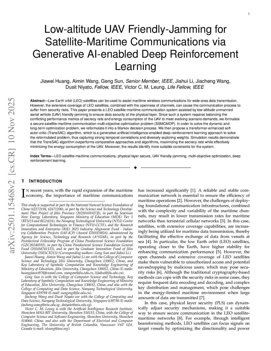 Low Earth orbit (LEO) satellites can be used to assist maritime wireless communications for wide-area data transmission. However, the extensive coverage of LEO satellites, combined with the openness of channels, can cause the communication process to suffer from security risks. This paper presents a LEO satellite-maritime communication system assisted by low-altitude unmanned aerial vehicle (UAV) friendly-jamming to ensure data security at the physical layer. Since such a system requires balancing the conflicting performance metrics of secrecy rate and energy consumption of the UAV to meet evolving scenario demands, we formulate a secure satellite-maritime communication multi-objective optimization problem (SSMCMOP). In order to solve the dynamic and long-term optimization problem, we reformulate it into a Markov decision process. We then propose a transformer-enhanced soft actor-critic (TransSAC) algorithm, which is a generative artificial intelligence-enabled deep reinforcement learning approach to solve the reformulated problem, thus capturing strong temporal correlations and diversely exploring weights. Simulation results demonstrate that the TransSAC algorithm outperforms comparative approaches and algorithms, maximizing the secrecy rate while effectively minimizing the energy consumption of the UAV. Moreover, the results identify more suitable constraints for the system.