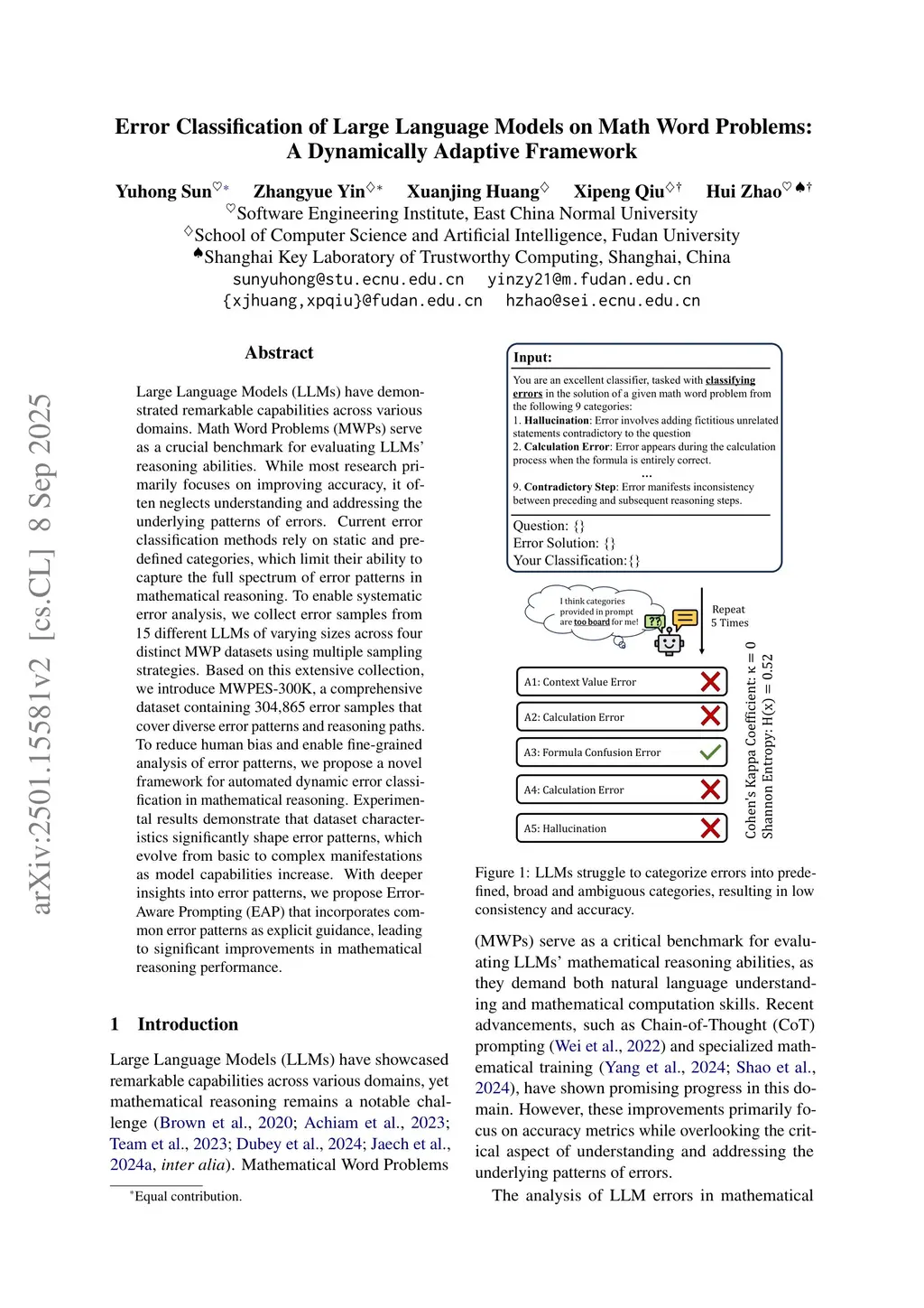 Error Classification of Large Language Models on Math Word Problems: A Dynamically Adaptive Framework