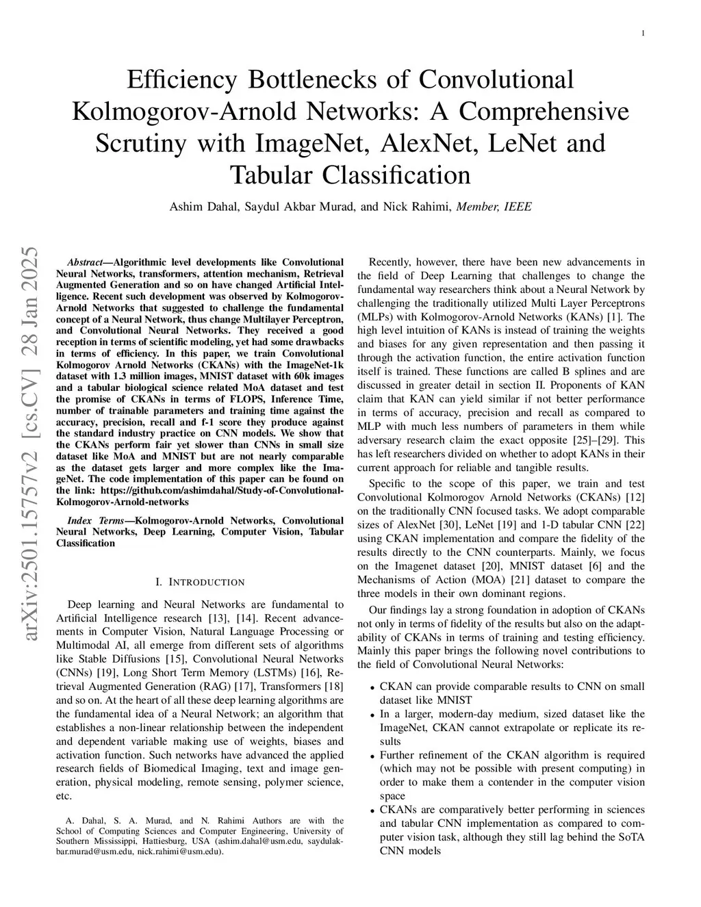 Algorithmic level developments like Convolutional Neural Networks, transformers, attention mechanism, Retrieval Augmented Generation and so on have changed Artificial Intelligence. Recent such development was observed by Kolmogorov-Arnold Networks that suggested to challenge the fundamental concept of a Neural Network, thus change Multilayer Perceptron, and Convolutional Neural Networks. They received a good reception in terms of scientific modeling, yet had some drawbacks in terms of efficiency. In this paper, we train Convolutional Kolmogorov Arnold Networks (CKANs) with the ImageNet-1k dataset with 1.3 million images, MNIST dataset with 60k images and a tabular biological science related MoA dataset and test the promise of CKANs in terms of FLOPS, Inference Time, number of trainable parameters and training time against the accuracy, precision, recall and f-1 score they produce against the standard industry practice on CNN models. We show that the CKANs perform fair yet slower than CNNs in small size dataset like MoA and MNIST but are not nearly comparable as the dataset gets larger and more complex like the ImageNet. The code implementation of this paper can be found on the link:this https URL