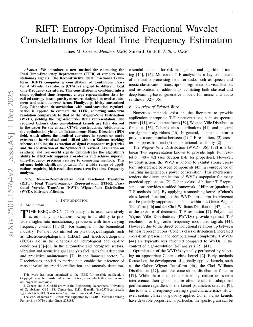 We introduce a new method for estimating the Ideal Time-Frequency Representation (ITFR) of complex nonstationary signals. The Reconstructive Ideal Fractional Transform (RIFT) computes a constellation of Continuous Fractional Wavelet Transforms (CFWTs) aligned to different local time-frequency curvatures. This constellation is combined into a single optimised time-frequency energy representation via a localised entropy-based sparsity measure, designed to resolve auto-terms and attenuate cross-terms. Finally, a positivity-constrained Lucy-Richardson deconvolution with total-variation regularisation is applied to estimate the ITFR, achieving auto-term resolution comparable to that of the Wigner-Ville Distribution (WVD), yielding the high-resolution RIFT representation. The required Cohen's class convolutional kernels are fully derived in the paper for the chosen CFWT constellations. Additionally, the optimisation yields an Instantaneous Phase Direction (IPD) field, which allows the localised curvature in speech or music extracts to be visualised and utilised within a Kalman tracking scheme, enabling the extraction of signal component trajectories and the construction of the Spline-RIFT variant. Evaluation on synthetic and real-world signals demonstrates the algorithm's ability to effectively suppress cross-terms and achieve superior time-frequency precision relative to competing methods. This advance holds significant potential for a wide range of applications requiring high-resolution cross-term-free time-frequency analysis.