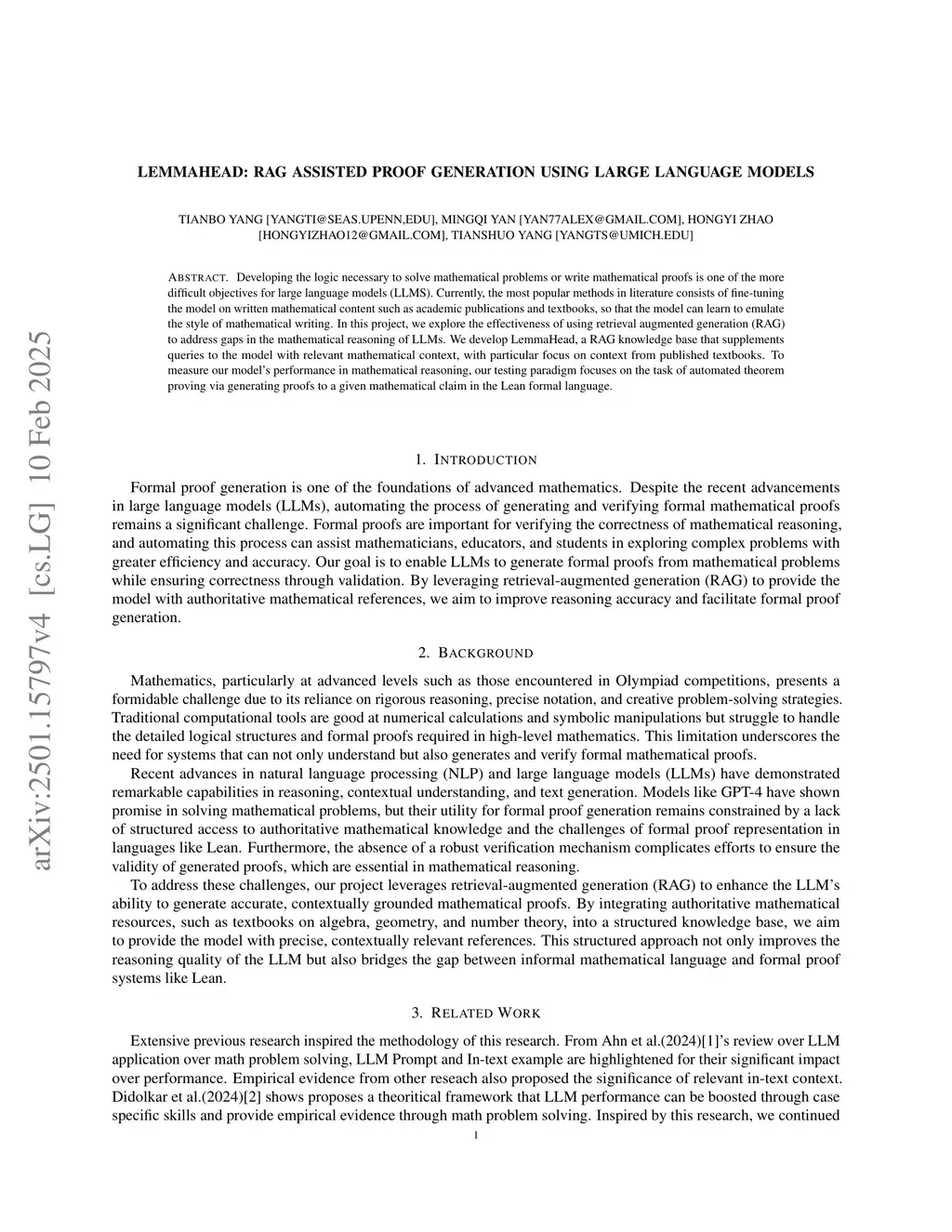 LemmaHead: RAG Assisted Proof Generation Using Large Language Models