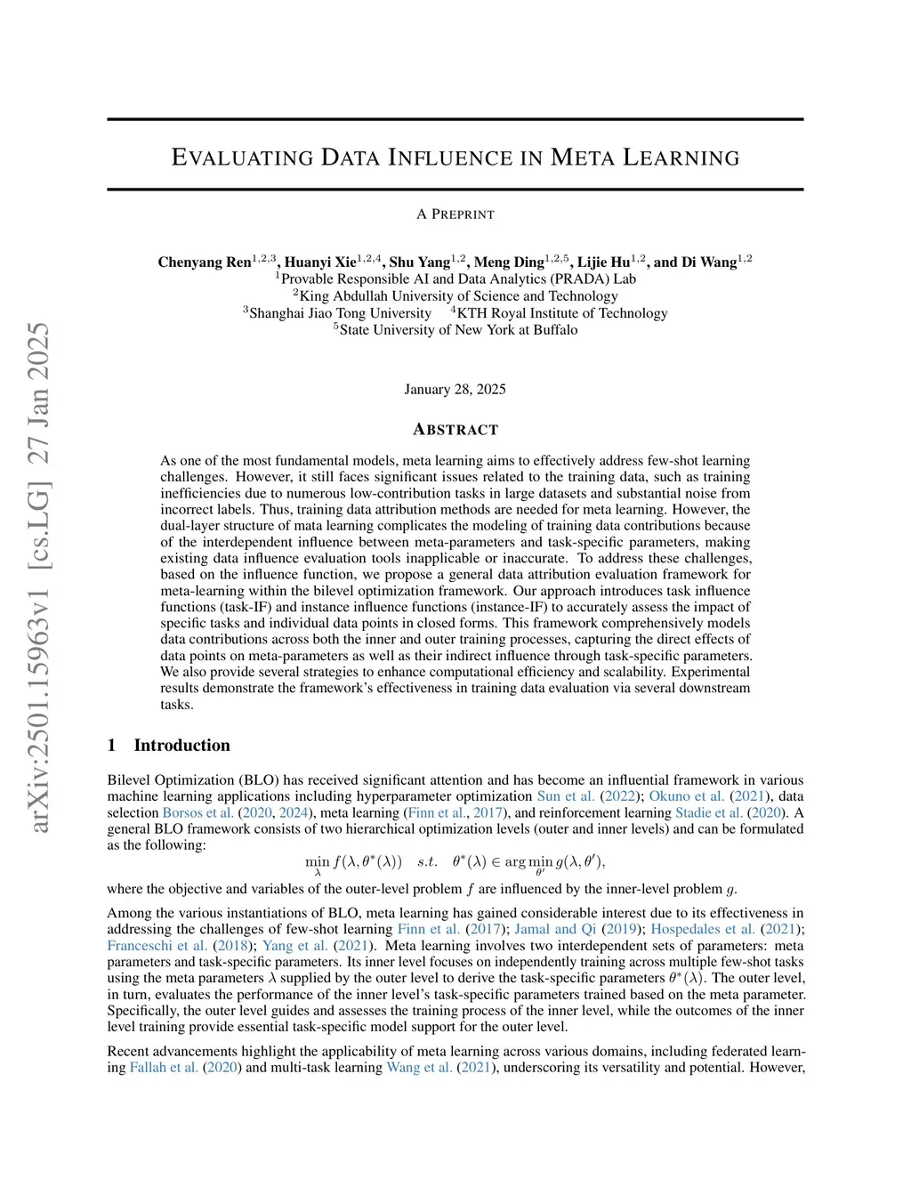 As one of the most fundamental models, meta learning aims to effectively address few-shot learning challenges. However, it still faces significant issues related to the training data, such as training inefficiencies due to numerous low-contribution tasks in large datasets and substantial noise from incorrect labels. Thus, training data attribution methods are needed for meta learning. However, the dual-layer structure of mata learning complicates the modeling of training data contributions because of the interdependent influence between meta-parameters and task-specific parameters, making existing data influence evaluation tools inapplicable or inaccurate. To address these challenges, based on the influence function, we propose a general data attribution evaluation framework for meta-learning within the bilevel optimization framework. Our approach introduces task influence functions (task-IF) and instance influence functions (instance-IF) to accurately assess the impact of specific tasks and individual data points in closed forms. This framework comprehensively models data contributions across both the inner and outer training processes, capturing the direct effects of data points on meta-parameters as well as their indirect influence through task-specific parameters. We also provide several strategies to enhance computational efficiency and scalability. Experimental results demonstrate the framework's effectiveness in training data evaluation via several downstream tasks.