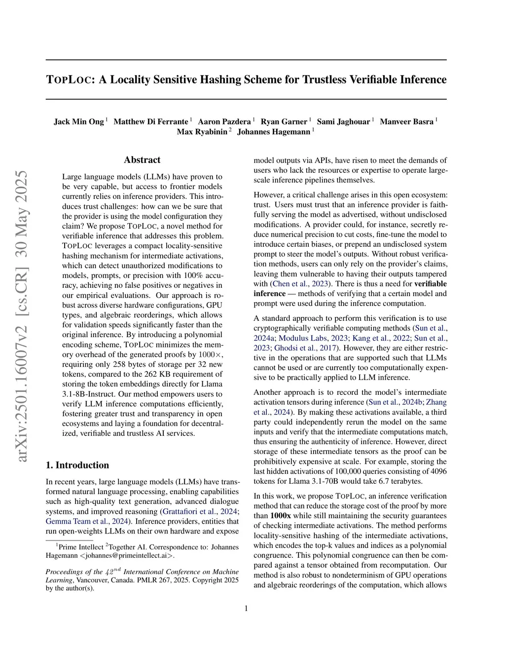 TOPLOC: A Locality Sensitive Hashing Scheme for Trustless Verifiable Inference