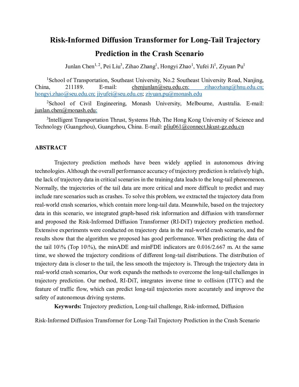 Trajectory prediction methods have been widely applied in autonomous driving technologies. Although the overall performance accuracy of trajectory prediction is relatively high, the lack of trajectory data in critical scenarios in the training data leads to the long-tail phenomenon. Normally, the trajectories of the tail data are more critical and more difficult to predict and may include rare scenarios such as crashes. To solve this problem, we extracted the trajectory data from real-world crash scenarios, which contain more long-tail data. Meanwhile, based on the trajectory data in this scenario, we integrated graph-based risk information and diffusion with transformer and proposed the Risk-Informed Diffusion Transformer (RI-DiT) trajectory prediction method. Extensive experiments were conducted on trajectory data in the real-world crash scenario, and the results show that the algorithm we proposed has good performance. When predicting the data of the tail 10\% (Top 10\%), the minADE and minFDE indicators are 0.016/2.667 m. At the same time, we showed the trajectory conditions of different long-tail distributions. The distribution of trajectory data is closer to the tail, the less smooth the trajectory is. Through the trajectory data in real-world crash scenarios, Our work expands the methods to overcome the long-tail challenges in trajectory prediction. Our method, RI-DiT, integrates inverse time to collision (ITTC) and the feature of traffic flow, which can predict long-tail trajectories more accurately and improve the safety of autonomous driving systems.