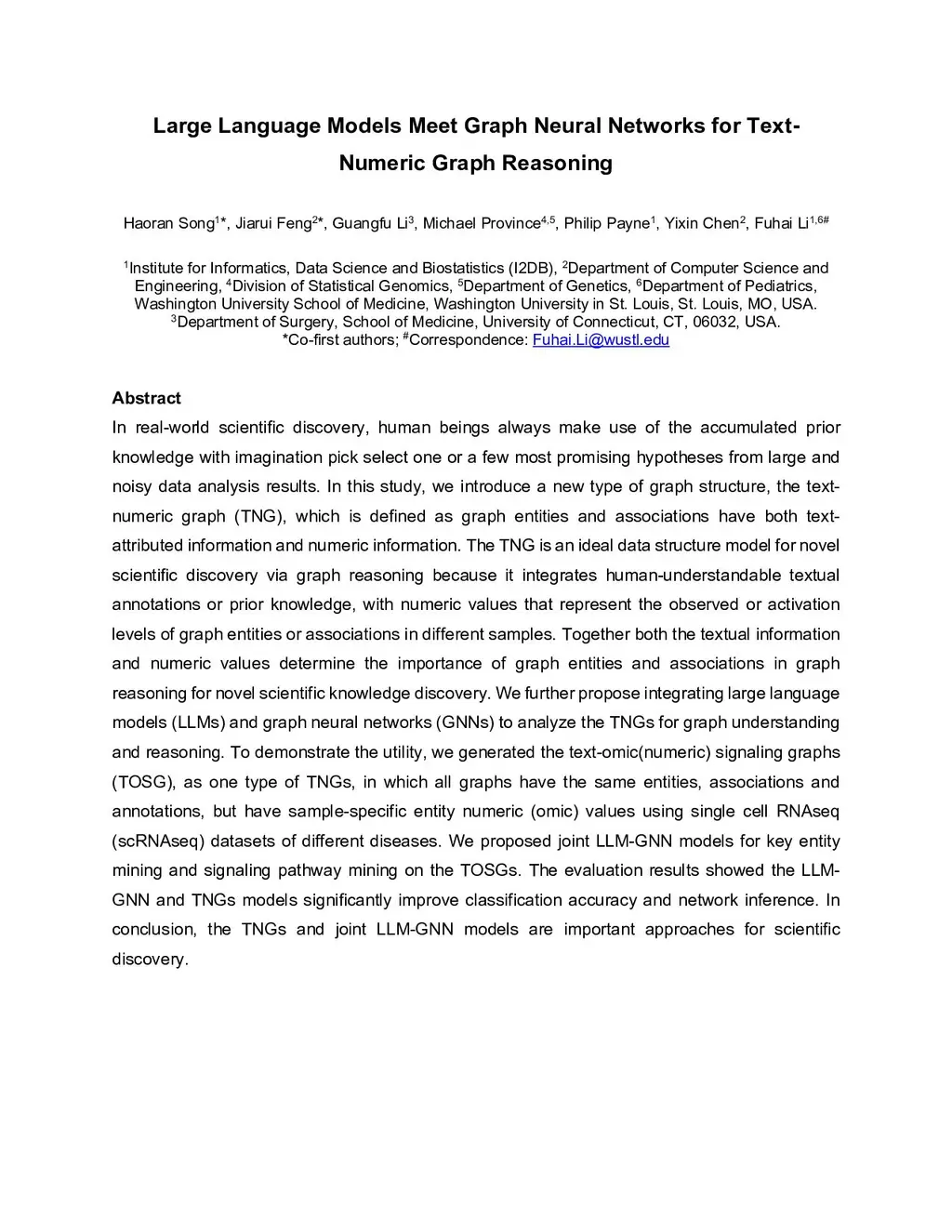 In real-world scientific discovery, human beings always make use of the accumulated prior knowledge with imagination pick select one or a few most promising hypotheses from large and noisy data analysis results. In this study, we introduce a new type of graph structure, the text-numeric graph (TNG), which is defined as graph entities and associations have both text-attributed information and numeric information. The TNG is an ideal data structure model for novel scientific discovery via graph reasoning because it integrates human-understandable textual annotations or prior knowledge, with numeric values that represent the observed or activation levels of graph entities or associations in different samples. Together both the textual information and numeric values determine the importance of graph entities and associations in graph reasoning for novel scientific knowledge discovery. We further propose integrating large language models (LLMs) and graph neural networks (GNNs) to analyze the TNGs for graph understanding and reasoning. To demonstrate the utility, we generated the text-omic(numeric) signaling graphs (TOSG), as one type of TNGs, in which all graphs have the same entities, associations and annotations, but have sample-specific entity numeric (omic) values using single cell RNAseq (scRNAseq) datasets of different diseases. We proposed joint LLM-GNN models for key entity mining and signaling pathway mining on the TOSGs. The evaluation results showed the LLM-GNN and TNGs models significantly improve classification accuracy and network inference. In conclusion, the TNGs and joint LLM-GNN models are important approaches for scientific discovery.