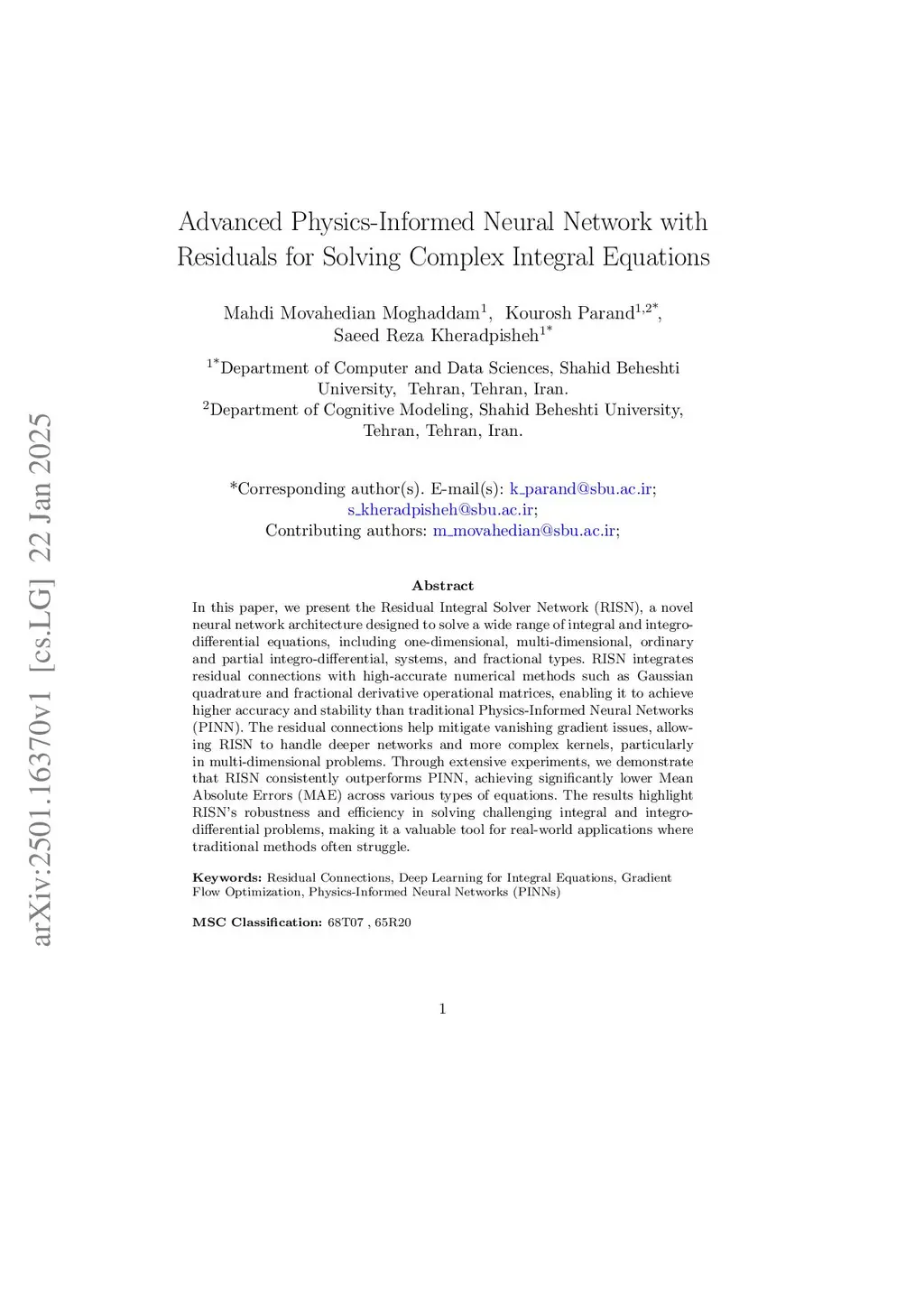 In this paper, we present the Residual Integral Solver Network (RISN), a novel neural network architecture designed to solve a wide range of integral and integro-differential equations, including one-dimensional, multi-dimensional, ordinary and partial integro-differential, systems, fractional types, and Helmholtz-type integral equations involving oscillatory kernels. RISN integrates residual connections with high-accuracy numerical methods such as Gaussian quadrature and fractional derivative operational matrices, enabling it to achieve higher accuracy and stability than traditional Physics-Informed Neural Networks (PINN). The residual connections help mitigate vanishing gradient issues, allowing RISN to handle deeper networks and more complex kernels, particularly in multi-dimensional problems. Through extensive experiments, we demonstrate that RISN consistently outperforms not only classical PINNs but also advanced variants such as Auxiliary PINN (A-PINN) and Self-Adaptive PINN (SA-PINN), achieving significantly lower Mean Absolute Errors (MAE) across various types of equations. These results highlight RISN's robustness and efficiency in solving challenging integral and integro-differential problems, making it a valuable tool for real-world applications where traditional methods often struggle.