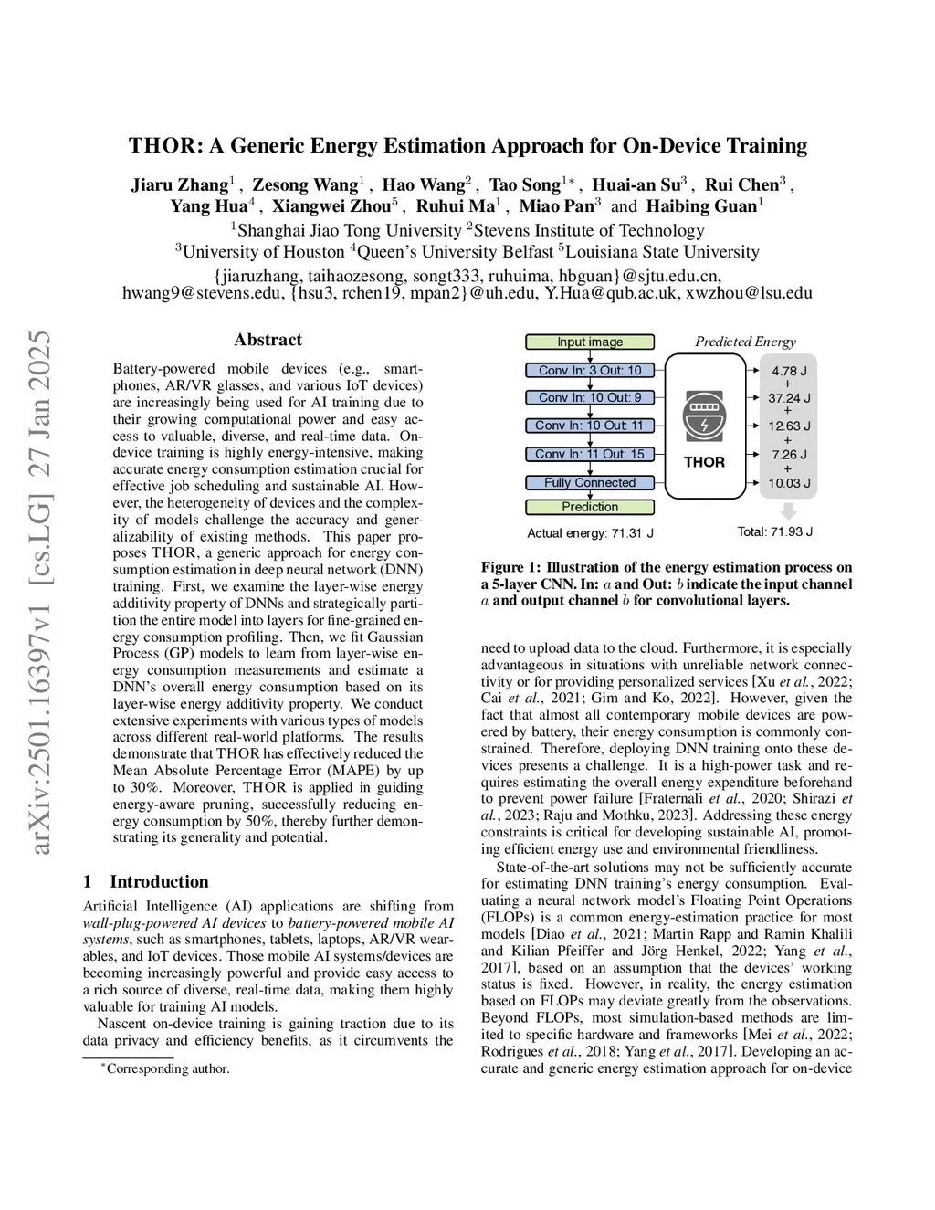 Battery-powered mobile devices (e.g., smartphones, AR/VR glasses, and various IoT devices) are increasingly being used for AI training due to their growing computational power and easy access to valuable, diverse, and real-time data. On-device training is highly energy-intensive, making accurate energy consumption estimation crucial for effective job scheduling and sustainable AI. However, the heterogeneity of devices and the complexity of models challenge the accuracy and generalizability of existing estimation methods.This paper proposes THOR, a generic approach for energy consumption estimation in deep neural network (DNN) training. First, we examine the layer-wise energy additivity property of DNNs and strategically partition the entire model into layers for fine-grained energy consumption profiling. Then, we fit Gaussian Process (GP) models to learn from layer-wise energy consumption measurements and estimate a DNN's overall energy consumption based on its layer-wise energy additivity property. We conduct extensive experiments with various types of models across different real-world platforms. The results demonstrate that THOR has effectively reduced the Mean Absolute Percentage Error (MAPE) by up to 30%. Moreover, THOR is applied in guiding energy-aware pruning, successfully reducing energy consumption by 50%, thereby further demonstrating its generality and potential.
