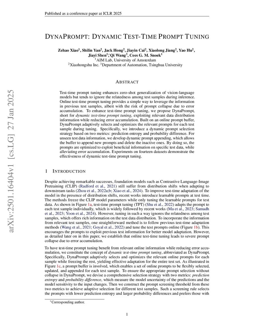 Test-time prompt tuning enhances zero-shot generalization of vision-language models but tends to ignore the relatedness among test samples during inference. Online test-time prompt tuning provides a simple way to leverage the information in previous test samples, albeit with the risk of prompt collapse due to error accumulation. To enhance test-time prompt tuning, we propose DynaPrompt, short for dynamic test-time prompt tuning, exploiting relevant data distribution information while reducing error accumulation. Built on an online prompt buffer, DynaPrompt adaptively selects and optimizes the relevant prompts for each test sample during tuning. Specifically, we introduce a dynamic prompt selection strategy based on two metrics: prediction entropy and probability difference. For unseen test data information, we develop dynamic prompt appending, which allows the buffer to append new prompts and delete the inactive ones. By doing so, the prompts are optimized to exploit beneficial information on specific test data, while alleviating error accumulation. Experiments on fourteen datasets demonstrate the effectiveness of dynamic test-time prompt tuning.