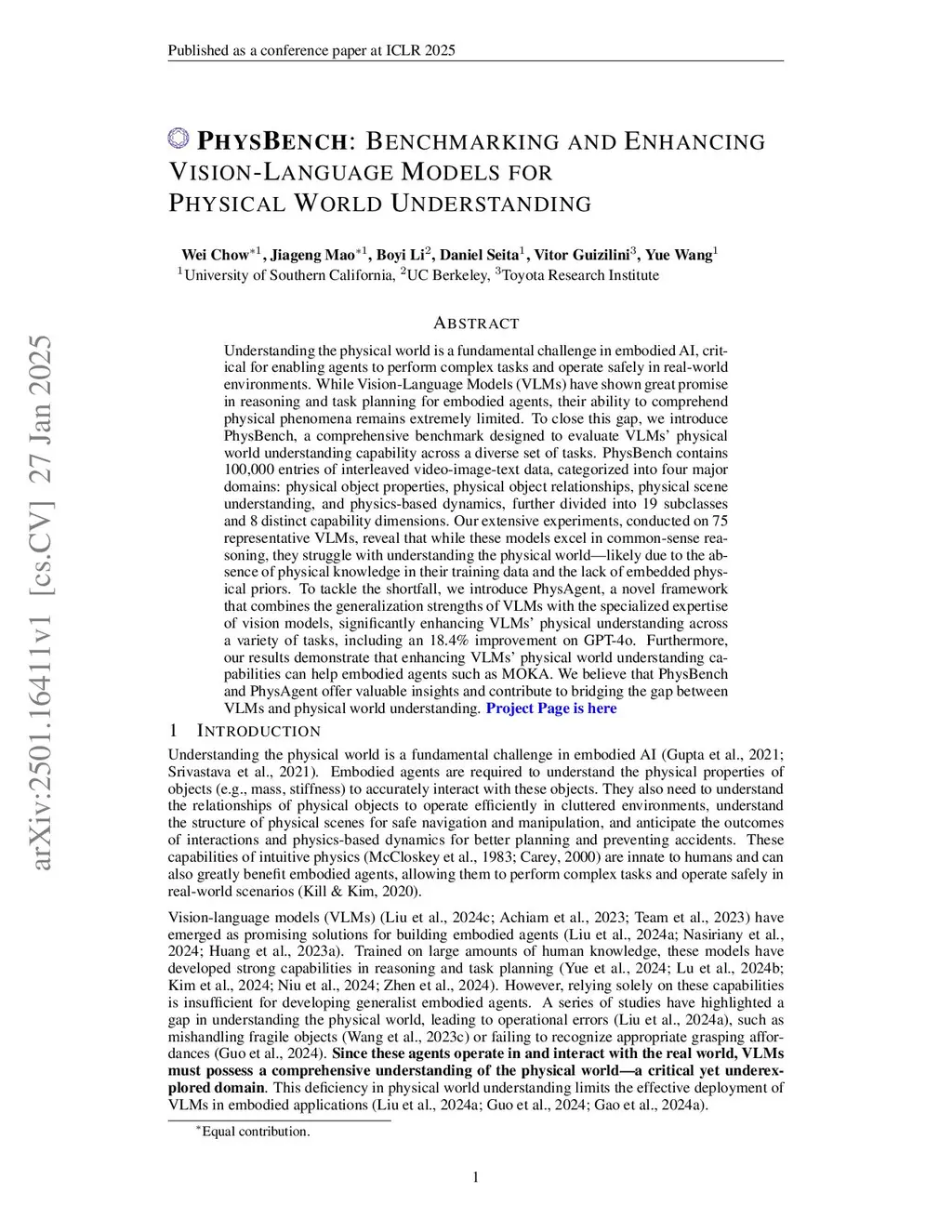 Understanding the physical world is a fundamental challenge in embodied AI, critical for enabling agents to perform complex tasks and operate safely in real-world environments. While Vision-Language Models (VLMs) have shown great promise in reasoning and task planning for embodied agents, their ability to comprehend physical phenomena remains extremely limited. To close this gap, we introduce PhysBench, a comprehensive benchmark designed to evaluate VLMs' physical world understanding capability across a diverse set of tasks. PhysBench contains 10,002 entries of interleaved video-image-text data, categorized into four major domains: physical object properties, physical object relationships, physical scene understanding, and physics-based dynamics, further divided into 19 subclasses and 8 distinct capability dimensions. Our extensive experiments, conducted on 75 representative VLMs, reveal that while these models excel in common-sense reasoning, they struggle with understanding the physical world -- likely due to the absence of physical knowledge in their training data and the lack of embedded physical priors. To tackle the shortfall, we introduce PhysAgent, a novel framework that combines the generalization strengths of VLMs with the specialized expertise of vision models, significantly enhancing VLMs' physical understanding across a variety of tasks, including an 18.4\% improvement on GPT-4o. Furthermore, our results demonstrate that enhancing VLMs' physical world understanding capabilities can help embodied agents such as MOKA. We believe that PhysBench and PhysAgent offer valuable insights and contribute to bridging the gap between VLMs and physical world understanding.