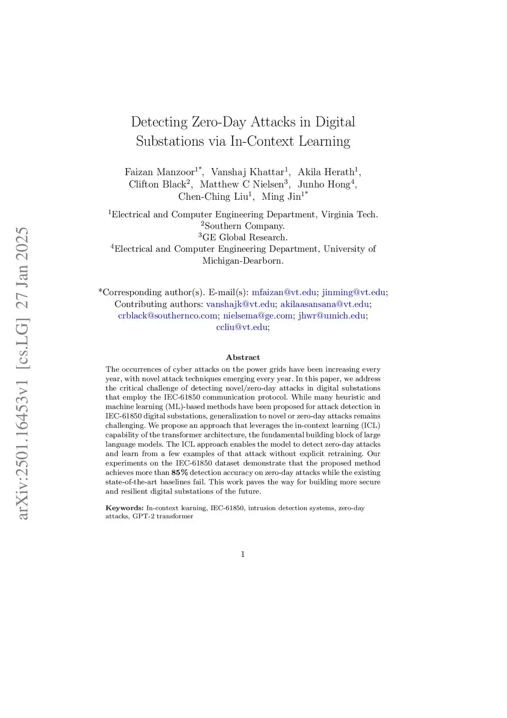The occurrences of cyber attacks on the power grids have been increasing every year, with novel attack techniques emerging every year. In this paper, we address the critical challenge of detecting novel/zero-day attacks in digital substations that employ the IEC-61850 communication protocol. While many heuristic and machine learning (ML)-based methods have been proposed for attack detection in IEC-61850 digital substations, generalization to novel or zero-day attacks remains challenging. We propose an approach that leverages the in-context learning (ICL) capability of the transformer architecture, the fundamental building block of large language models. The ICL approach enables the model to detect zero-day attacks and learn from a few examples of that attack without explicit retraining. Our experiments on the IEC-61850 dataset demonstrate that the proposed method achieves more than detection accuracy on zero-day attacks while the existing state-of-the-art baselines fail. This work paves the way for building more secure and resilient digital substations of the future.