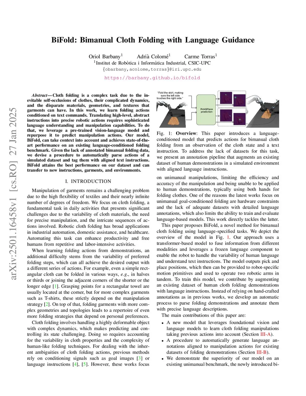 Cloth folding is a complex task due to the inevitable self-occlusions of clothes, their complicated dynamics, and the disparate materials, geometries, and textures that garments can have. In this work, we learn folding actions conditioned on text commands. Translating high-level, abstract instructions into precise robotic actions requires sophisticated language understanding and manipulation capabilities. To do that, we leverage a pre-trained vision-language model and repurpose it to predict manipulation actions. Our model, BiFold, can take context into account and achieves state-of-the-art performance on an existing language-conditioned folding benchmark. To address the lack of annotated bimanual folding data, we introduce a novel dataset with automatically parsed actions and language-aligned instructions, enabling better learning of text-conditioned manipulation. BiFold attains the best performance on our dataset and demonstrates strong generalization to new instructions, garments, and environments.
