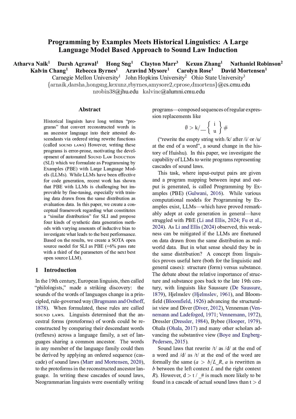 Historical linguists have long written "programs" that convert reconstructed words in an ancestor language into their attested descendants via ordered string rewrite functions (called sound laws) However, writing these programs is time-consuming, motivating the development of automated Sound Law Induction (SLI) which we formulate as Programming by Examples (PBE) with Large Language Models (LLMs) in this paper. While LLMs have been effective for code generation, recent work has shown that PBE is challenging but improvable by fine-tuning, especially with training data drawn from the same distribution as evaluation data. In this paper, we create a conceptual framework of what constitutes a "similar distribution" for SLI and propose four kinds of synthetic data generation methods with varying amounts of inductive bias to investigate what leads to the best performance. Based on the results we create a SOTA open-source model for SLI as PBE (+6% pass rate with a third of the parameters of the second-best LLM) and also highlight exciting future directions for PBE research.