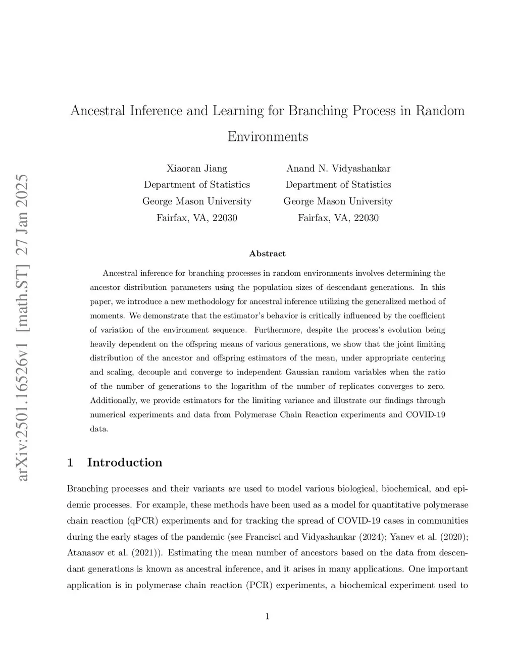 Ancestral inference for branching processes in random environments involves determining the ancestor distribution parameters using the population sizes of descendant generations. In this paper, we introduce a new methodology for ancestral inference utilizing the generalized method of moments. We demonstrate that the estimator's behavior is critically influenced by the coefficient of variation of the environment sequence. Furthermore, despite the process's evolution being heavily dependent on the offspring means of various generations, we show that the joint limiting distribution of the ancestor and offspring estimators of the mean, under appropriate centering and scaling, decouple and converge to independent Gaussian random variables when the ratio of the number of generations to the logarithm of the number of replicates converges to zero. Additionally, we provide estimators for the limiting variance and illustrate our findings through numerical experiments and data from Polymerase Chain Reaction experiments and COVID-19 data.