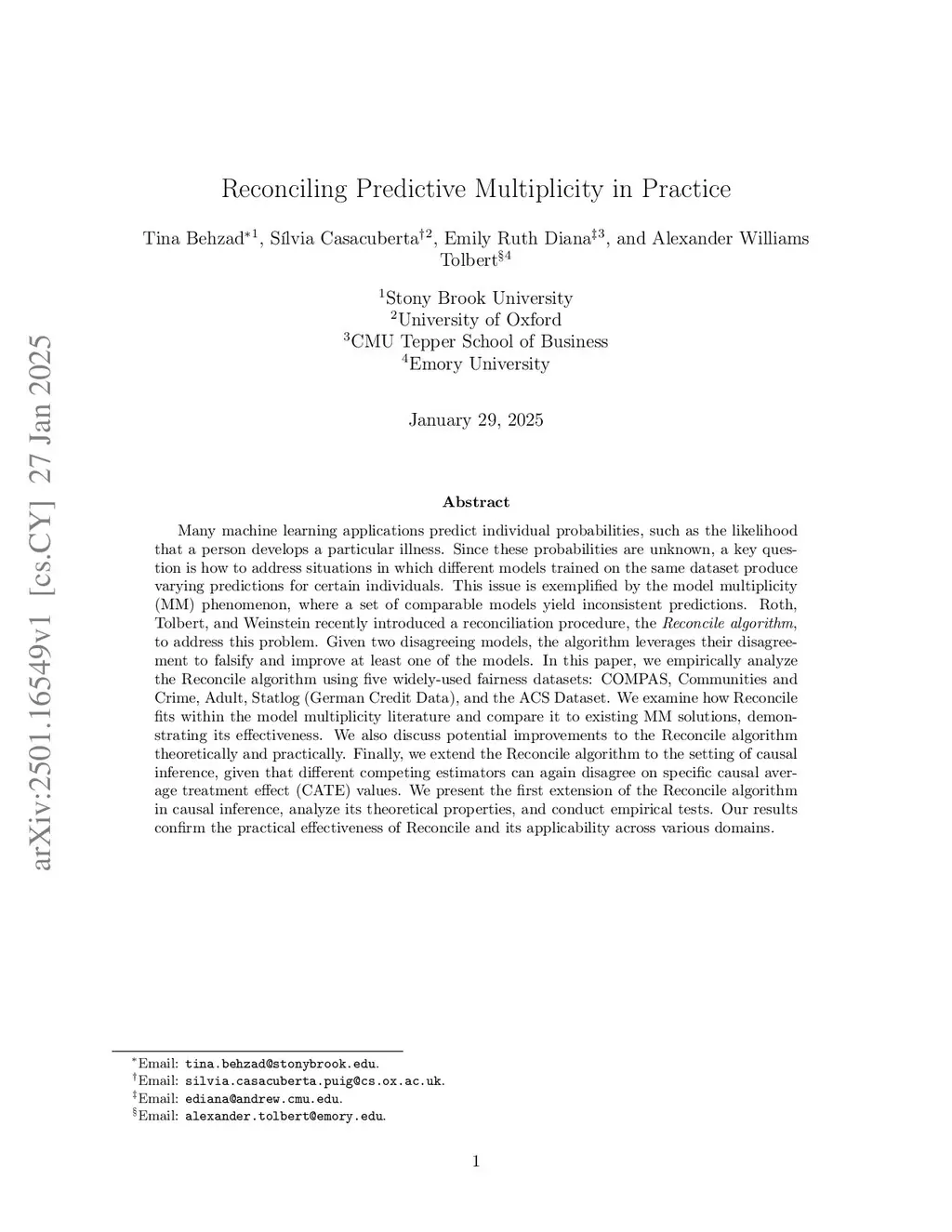 Many machine learning applications predict individual probabilities, such as the likelihood that a person develops a particular illness. Since these probabilities are unknown, a key question is how to address situations in which different models trained on the same dataset produce varying predictions for certain individuals. This issue is exemplified by the model multiplicity (MM) phenomenon, where a set of comparable models yield inconsistent predictions. Roth, Tolbert, and Weinstein recently introduced a reconciliation procedure, the Reconcile algorithm, to address this problem. Given two disagreeing models, the algorithm leverages their disagreement to falsify and improve at least one of the models. In this paper, we empirically analyze the Reconcile algorithm using five widely-used fairness datasets: COMPAS, Communities and Crime, Adult, Statlog (German Credit Data), and the ACS Dataset. We examine how Reconcile fits within the model multiplicity literature and compare it to existing MM solutions, demonstrating its effectiveness. We also discuss potential improvements to the Reconcile algorithm theoretically and practically. Finally, we extend the Reconcile algorithm to the setting of causal inference, given that different competing estimators can again disagree on specific causal average treatment effect (CATE) values. We present the first extension of the Reconcile algorithm in causal inference, analyze its theoretical properties, and conduct empirical tests. Our results confirm the practical effectiveness of Reconcile and its applicability across various domains.