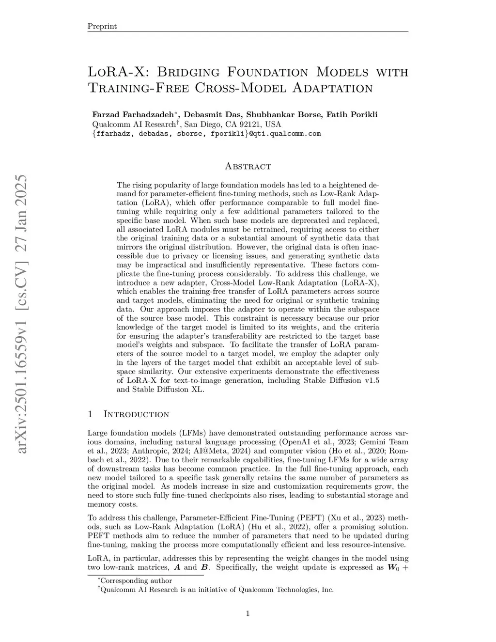 The rising popularity of large foundation models has led to a heightened demand for parameter-efficient fine-tuning methods, such as Low-Rank Adaptation (LoRA), which offer performance comparable to full model fine-tuning while requiring only a few additional parameters tailored to the specific base model. When such base models are deprecated and replaced, all associated LoRA modules must be retrained, requiring access to either the original training data or a substantial amount of synthetic data that mirrors the original distribution. However, the original data is often inaccessible due to privacy or licensing issues, and generating synthetic data may be impractical and insufficiently representative. These factors complicate the fine-tuning process considerably. To address this challenge, we introduce a new adapter, Cross-Model Low-Rank Adaptation (LoRA-X), which enables the training-free transfer of LoRA parameters across source and target models, eliminating the need for original or synthetic training data. Our approach imposes the adapter to operate within the subspace of the source base model. This constraint is necessary because our prior knowledge of the target model is limited to its weights, and the criteria for ensuring the adapter's transferability are restricted to the target base model's weights and subspace. To facilitate the transfer of LoRA parameters of the source model to a target model, we employ the adapter only in the layers of the target model that exhibit an acceptable level of subspace similarity. Our extensive experiments demonstrate the effectiveness of LoRA-X for text-to-image generation, including Stable Diffusion v1.5 and Stable Diffusion XL.