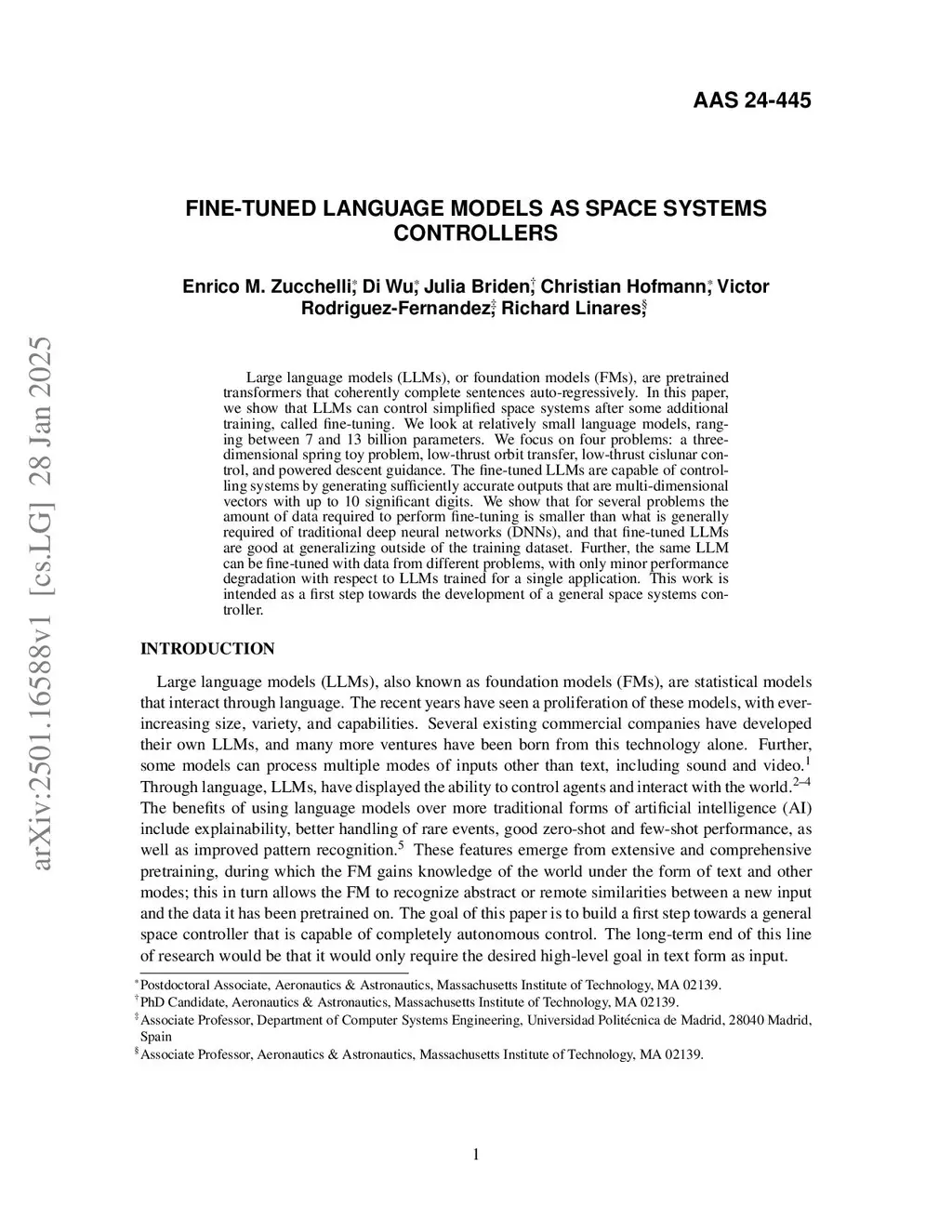 Large language models (LLMs), or foundation models (FMs), are pretrained transformers that coherently complete sentences auto-regressively. In this paper, we show that LLMs can control simplified space systems after some additional training, called fine-tuning. We look at relatively small language models, ranging between 7 and 13 billion parameters. We focus on four problems: a three-dimensional spring toy problem, low-thrust orbit transfer, low-thrust cislunar control, and powered descent guidance. The fine-tuned LLMs are capable of controlling systems by generating sufficiently accurate outputs that are multi-dimensional vectors with up to 10 significant digits. We show that for several problems the amount of data required to perform fine-tuning is smaller than what is generally required of traditional deep neural networks (DNNs), and that fine-tuned LLMs are good at generalizing outside of the training dataset. Further, the same LLM can be fine-tuned with data from different problems, with only minor performance degradation with respect to LLMs trained for a single application. This work is intended as a first step towards the development of a general space systems controller.