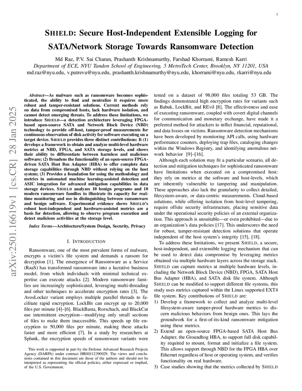 Ransomware's escalating sophistication necessitates tamper-resistant, off-host detection solutions that capture deep disk activity beyond the reach of a compromised operating system. Existing detection systems use host/kernel signals or rely on coarse block-I/O statistics, which are easy to evade and miss filesystem semantics. The filesystem layer itself remains underexplored as a source of robust indicators for storage-controller-level defense. To address this, we present SHIELD: a Secure Host-Independent Extensible Metric Logging Framework for Tamper-Proof Detection and Real-Time Mitigation of Ransomware Threats. SHIELD parses and logs filesystem-level features that cannot be evaded or obfuscated to expose deep disk activity for real-time ML-based detection and mitigation. We evaluate the efficacy of these metrics through experiments with both binary (benign vs. malicious behavior) and multiclass (ransomware strain identification) classifiers. In evaluations across diverse ransomware families, the best binary classifier achieves 97.29% accuracy in identifying malicious disk behavior. A hardware-only feature set that excludes all transport-layer metrics retains 95.97% accuracy, confirming feasibility for FPGA/ASIC deployment within the storage controller datapath. In a proof-of-concept closed-loop deployment, SHIELD halts disk operations within tens of disk actions, limiting targeted files affected to <0.4% for zero-shot strains at small action-windows, while maintaining low false-positive rates (<3.6%) on unseen benign applications. Results demonstrate that filesystem-aware, off-host telemetry enables accurate, resilient ransomware detection, including intermittent/partial encryption, and is practical for embedded integration in storage controllers or alongside other defense mechanisms.