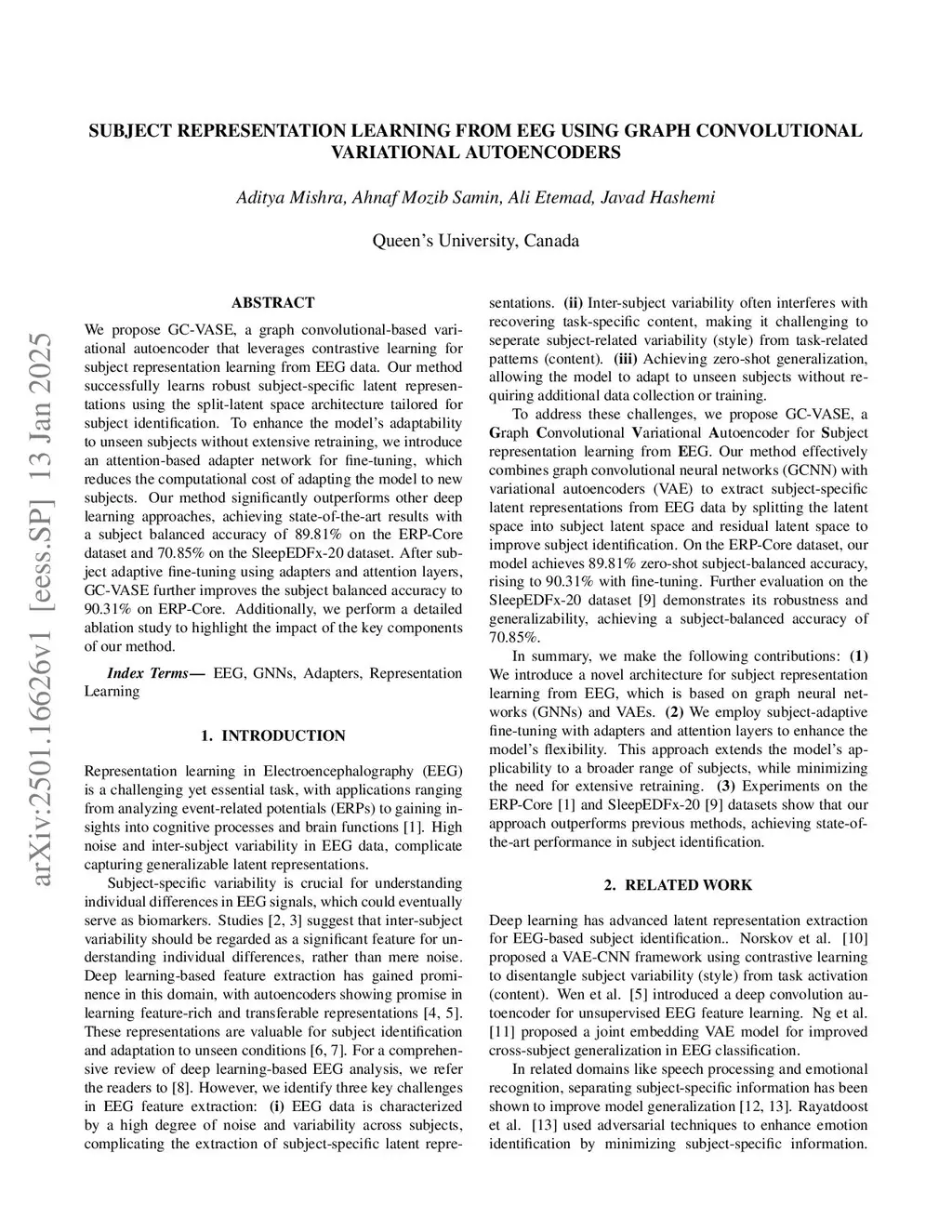 We propose GC-VASE, a graph convolutional-based variational autoencoder that leverages contrastive learning for subject representation learning from EEG data. Our method successfully learns robust subject-specific latent representations using the split-latent space architecture tailored for subject identification. To enhance the model's adaptability to unseen subjects without extensive retraining, we introduce an attention-based adapter network for fine-tuning, which reduces the computational cost of adapting the model to new subjects. Our method significantly outperforms other deep learning approaches, achieving state-of-the-art results with a subject balanced accuracy of 89.81% on the ERP-Core dataset and 70.85% on the SleepEDFx-20 dataset. After subject adaptive fine-tuning using adapters and attention layers, GC-VASE further improves the subject balanced accuracy to 90.31% on ERP-Core. Additionally, we perform a detailed ablation study to highlight the impact of the key components of our method.