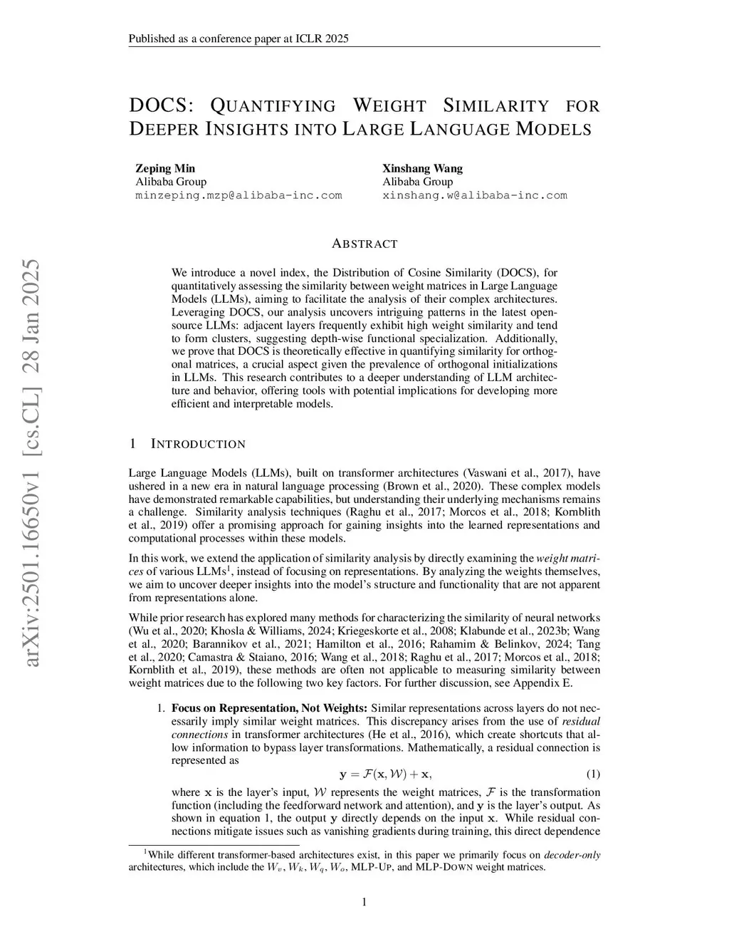 DOCS: Quantifying Weight Similarity for Deeper Insights into Large Language Models