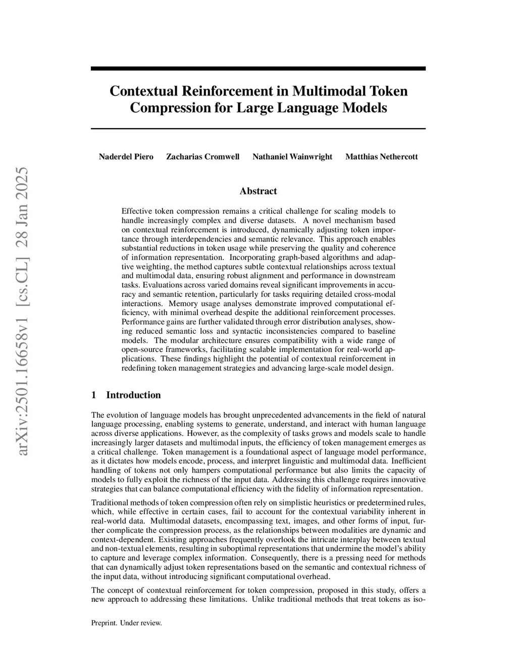 Effective token compression remains a critical challenge for scaling models to handle increasingly complex and diverse datasets. A novel mechanism based on contextual reinforcement is introduced, dynamically adjusting token importance through interdependencies and semantic relevance. This approach enables substantial reductions in token usage while preserving the quality and coherence of information representation. Incorporating graph-based algorithms and adaptive weighting, the method captures subtle contextual relationships across textual and multimodal data, ensuring robust alignment and performance in downstream tasks. Evaluations across varied domains reveal significant improvements in accuracy and semantic retention, particularly for tasks requiring detailed cross-modal interactions. Memory usage analyses demonstrate improved computational efficiency, with minimal overhead despite the additional reinforcement processes. Performance gains are further validated through error distribution analyses, showing reduced semantic loss and syntactic inconsistencies compared to baseline models. The modular architecture ensures compatibility with a wide range of open-source frameworks, facilitating scalable implementation for real-world applications. These findings highlight the potential of contextual reinforcement in redefining token management strategies and advancing large-scale model design.