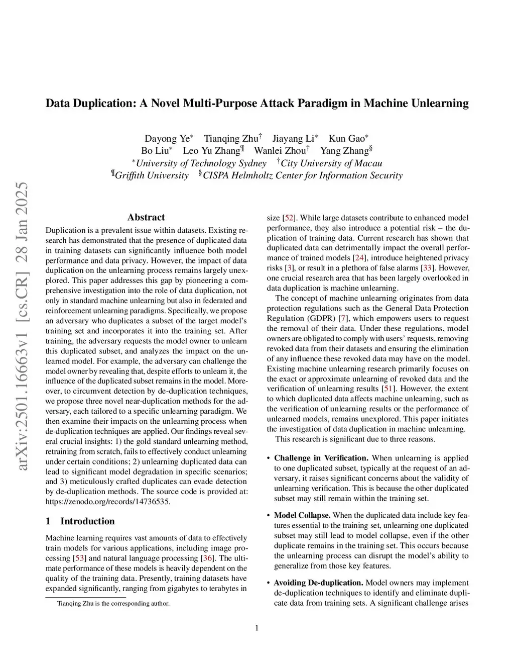 Data Duplication: A Novel Multi-Purpose Attack Paradigm in Machine Unlearning