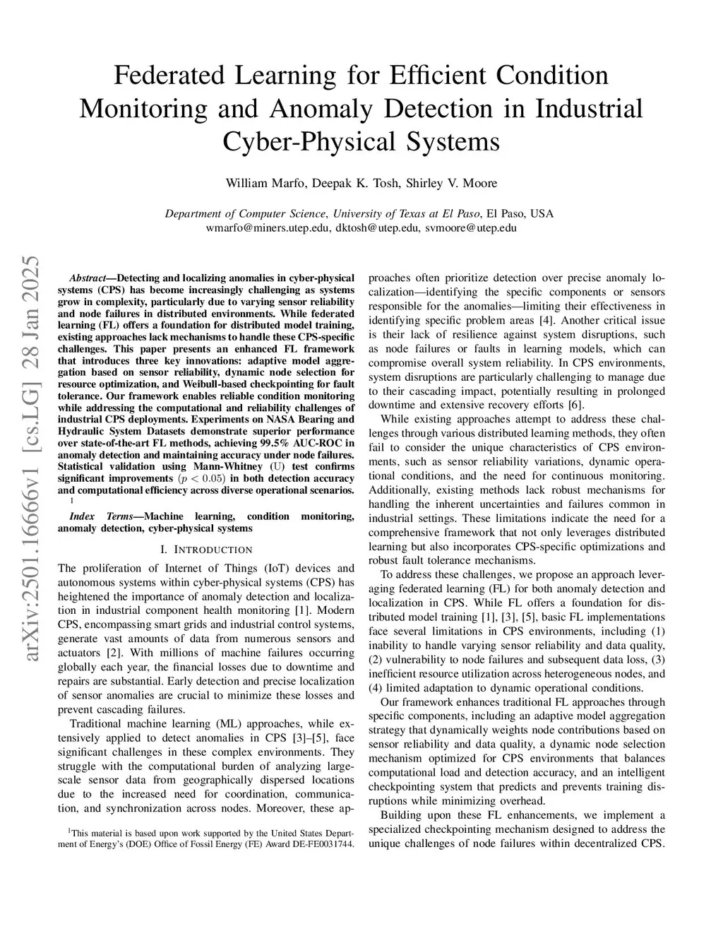 Detecting and localizing anomalies in cyber-physical systems (CPS) has become increasingly challenging as systems grow in complexity, particularly due to varying sensor reliability and node failures in distributed environments. While federated learning (FL) provides a foundation for distributed model training, existing approaches often lack mechanisms to address these CPS-specific challenges. This paper introduces an enhanced FL framework with three key innovations: adaptive model aggregation based on sensor reliability, dynamic node selection for resource optimization, and Weibull-based checkpointing for fault tolerance. The proposed framework ensures reliable condition monitoring while tackling the computational and reliability challenges of industrial CPS deployments. Experiments on the NASA Bearing and Hydraulic System datasets demonstrate superior performance compared to state-of-the-art FL methods, achieving 99.5% AUC-ROC in anomaly detection and maintaining accuracy even under node failures. Statistical validation using the Mann-Whitney U test confirms significant improvements, with a p-value less than 0.05, in both detection accuracy and computational efficiency across various operational scenarios.