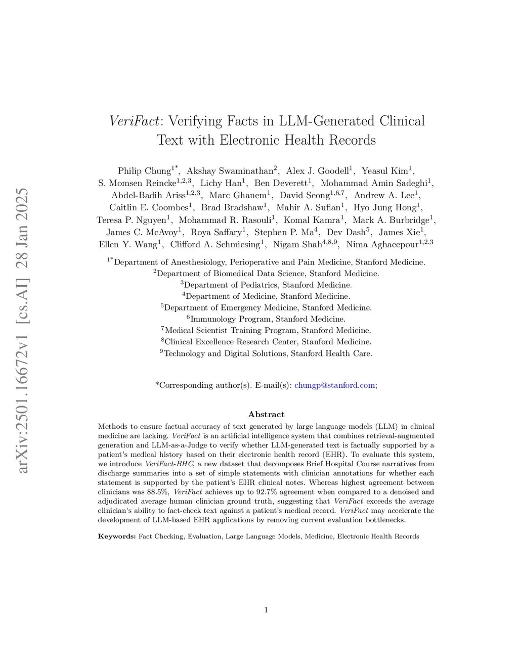 Methods to ensure factual accuracy of text generated by large language models (LLM) in clinical medicine are lacking. VeriFact is an artificial intelligence system that combines retrieval-augmented generation and LLM-as-a-Judge to verify whether LLM-generated text is factually supported by a patient's medical history based on their electronic health record (EHR). To evaluate this system, we introduce VeriFact-BHC, a new dataset that decomposes Brief Hospital Course narratives from discharge summaries into a set of simple statements with clinician annotations for whether each statement is supported by the patient's EHR clinical notes. Whereas highest agreement between clinicians was 88.5%, VeriFact achieves up to 92.7% agreement when compared to a denoised and adjudicated average human clinican ground truth, suggesting that VeriFact exceeds the average clinician's ability to fact-check text against a patient's medical record. VeriFact may accelerate the development of LLM-based EHR applications by removing current evaluation bottlenecks.