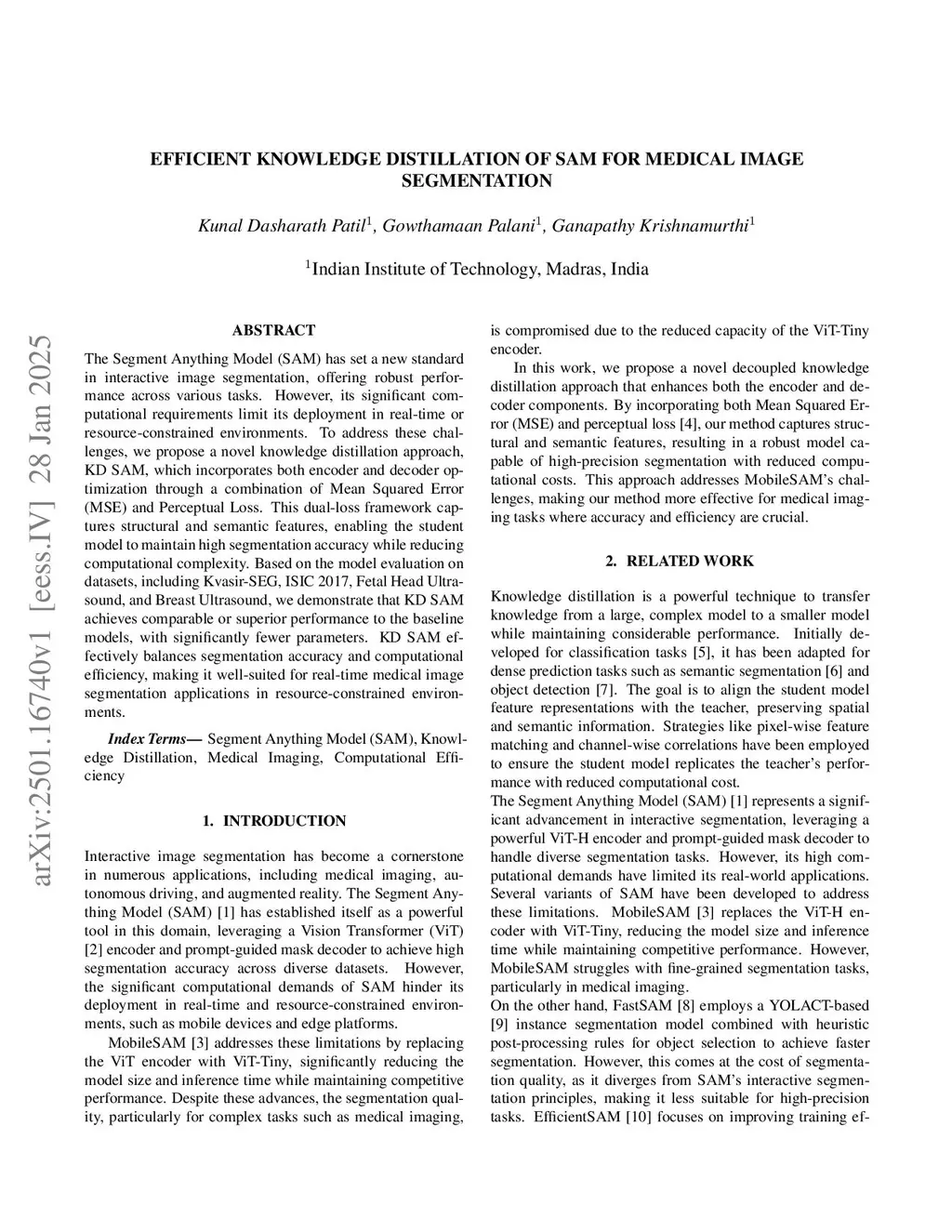 The Segment Anything Model (SAM) has set a new standard in interactive image segmentation, offering robust performance across various tasks. However, its significant computational requirements limit its deployment in real-time or resource-constrained environments. To address these challenges, we propose a novel knowledge distillation approach, KD SAM, which incorporates both encoder and decoder optimization through a combination of Mean Squared Error (MSE) and Perceptual Loss. This dual-loss framework captures structural and semantic features, enabling the student model to maintain high segmentation accuracy while reducing computational complexity. Based on the model evaluation on datasets, including Kvasir-SEG, ISIC 2017, Fetal Head Ultrasound, and Breast Ultrasound, we demonstrate that KD SAM achieves comparable or superior performance to the baseline models, with significantly fewer parameters. KD SAM effectively balances segmentation accuracy and computational efficiency, making it well-suited for real-time medical image segmentation applications in resource-constrained environments.
