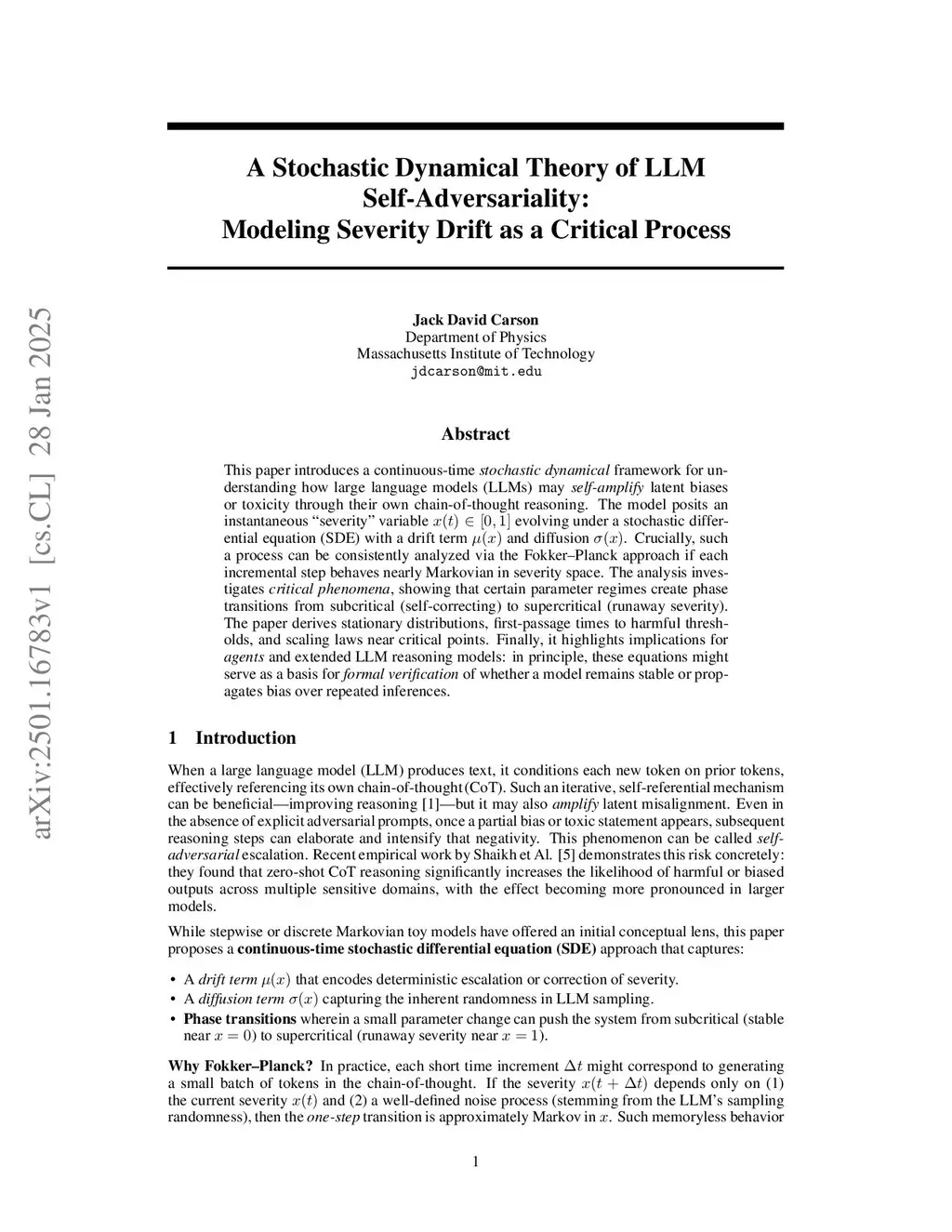 This paper introduces a continuous-time stochastic dynamical framework for understanding how large language models (LLMs) may self-amplify latent biases or toxicity through their own chain-of-thought reasoning. The model posits an instantaneous "severity" variable evolving under a stochastic differential equation (SDE) with a drift term and diffusion . Crucially, such a process can be consistently analyzed via the Fokker--Planck approach if each incremental step behaves nearly Markovian in severity space. The analysis investigates critical phenomena, showing that certain parameter regimes create phase transitions from subcritical (self-correcting) to supercritical (runaway severity). The paper derives stationary distributions, first-passage times to harmful thresholds, and scaling laws near critical points. Finally, it highlights implications for agents and extended LLM reasoning models: in principle, these equations might serve as a basis for formal verification of whether a model remains stable or propagates bias over repeated inferences.