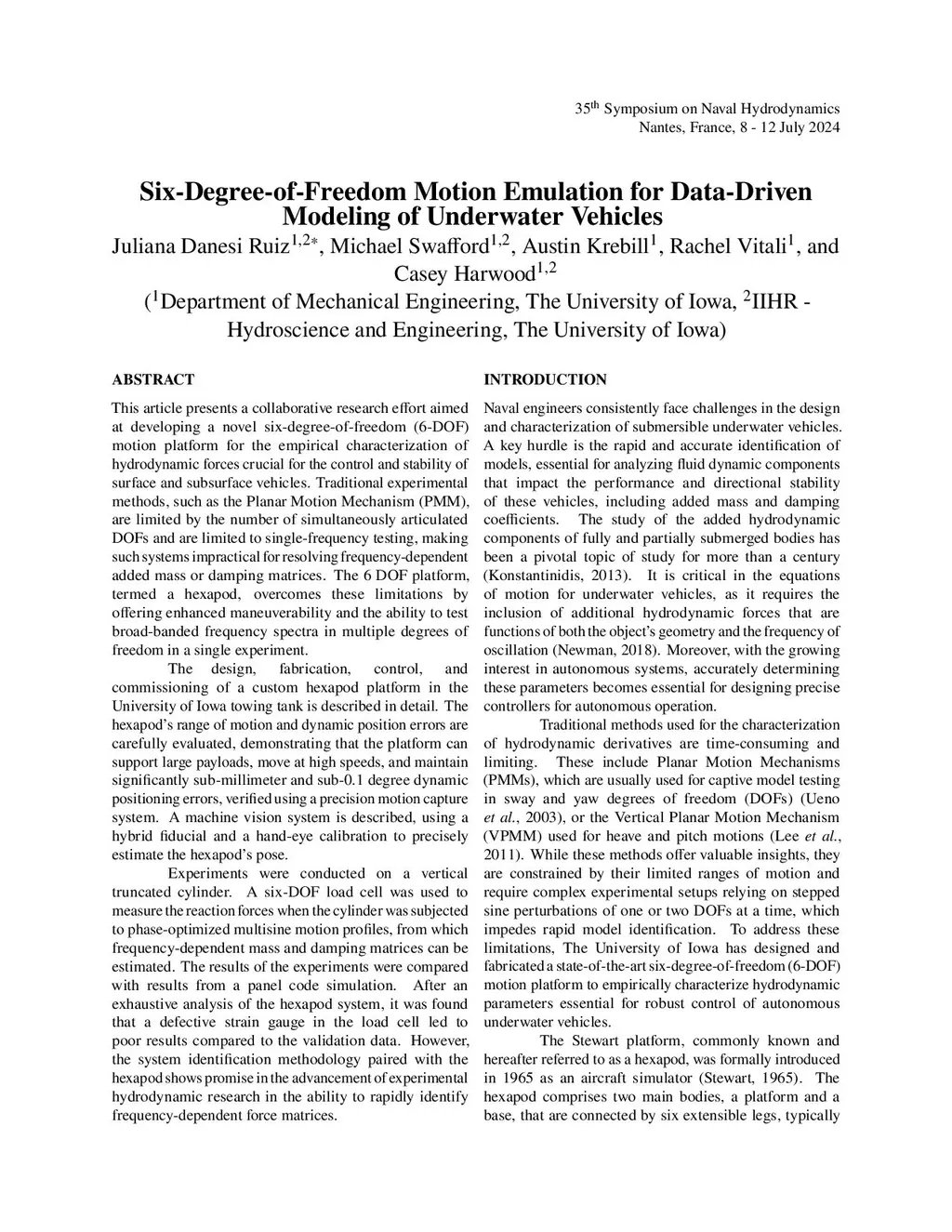 This article presents a collaborative research effort aimed at developing a novel six-degree-of-freedom (6-DOF) motion platform for the empirical characterization of hydrodynamic forces crucial for the control and stability of surface and subsurface vehicles. Traditional experimental methods, such as the Planar Motion Mechanism (PMM), are limited by the number of simultaneously articulated DOFs and are limited to single-frequency testing, making such systems impractical for resolving frequency-dependent added mass or damping matrices. The 6 DOF platform, termed a hexapod, overcomes these limitations by offering enhanced maneuverability and the ability to test broad-banded frequency spectra in multiple degrees of freedom in a single experiment.