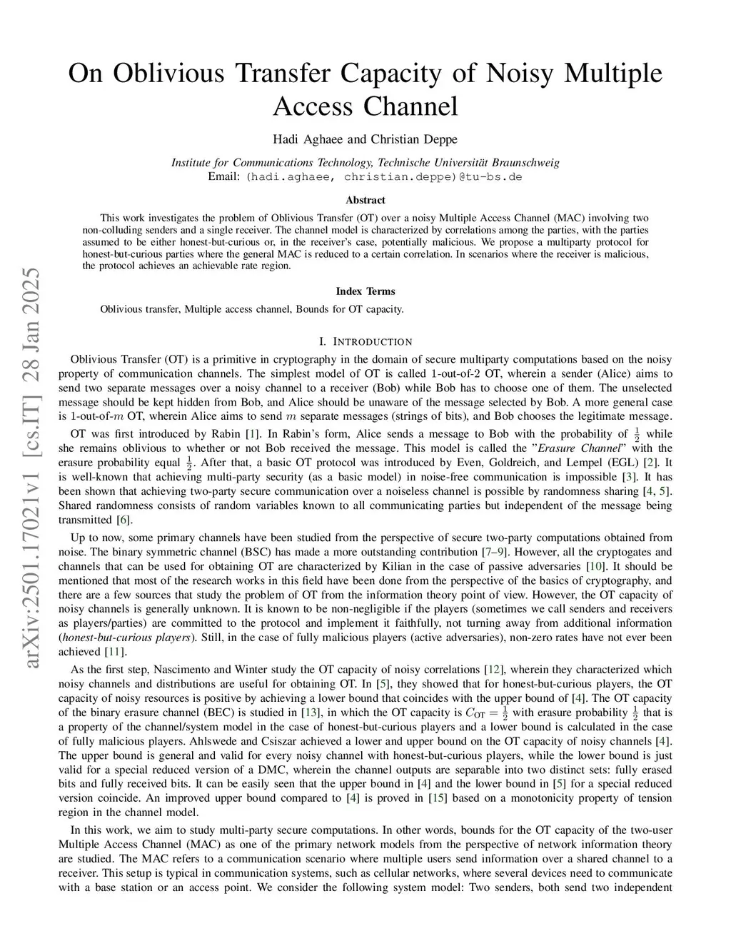 In this paper, we study the information-theoretic limits of oblivious transfer via noisy channels. We also investigate oblivious transfer over a noisy multiple-access channel with two non-colluding senders and a single receiver. The channel is modeled through correlations among the parties, who may be honest-but-curious or, in the case of the receiver, potentially malicious. We first revisit the information-theoretic limits of two-party oblivious transfer and then extend these results to the multiple-access setting. For honest-but-curious participants, we introduce a multiparty protocol that reduces a general multiple access channel to a suitable correlation model. In scenarios with a malicious receiver, we characterize an achievable oblivious transfer rate region.