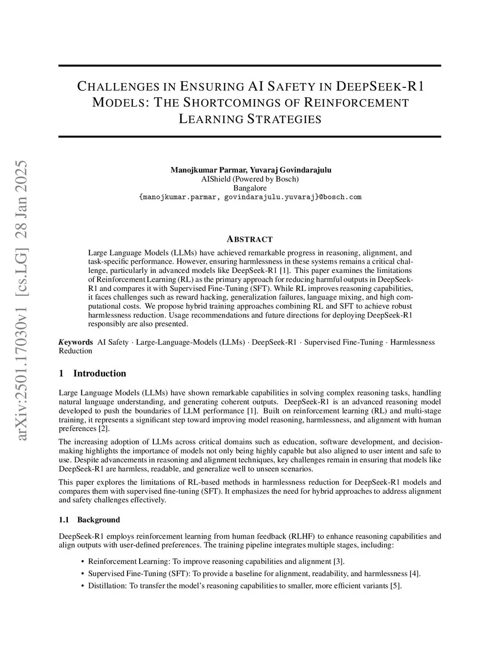 Large Language Models (LLMs) have achieved remarkable progress in reasoning, alignment, and task-specific performance. However, ensuring harmlessness in these systems remains a critical challenge, particularly in advanced models like DeepSeek-R1. This paper examines the limitations of Reinforcement Learning (RL) as the primary approach for reducing harmful outputs in DeepSeek-R1 and compares it with Supervised Fine-Tuning (SFT). While RL improves reasoning capabilities, it faces challenges such as reward hacking, generalization failures, language mixing, and high computational costs. We propose hybrid training approaches combining RL and SFT to achieve robust harmlessness reduction. Usage recommendations and future directions for deploying DeepSeek-R1 responsibly are also presented.