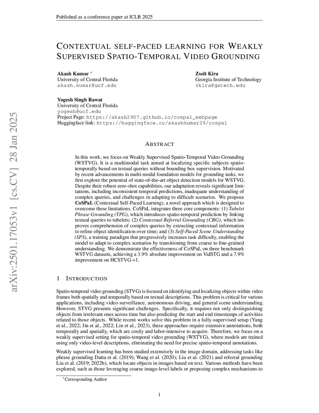 In this work, we focus on Weakly Supervised Spatio-Temporal Video Grounding (WSTVG). It is a multimodal task aimed at localizing specific subjects spatio-temporally based on textual queries without bounding box supervision. Motivated by recent advancements in multi-modal foundation models for grounding tasks, we first explore the potential of state-of-the-art object detection models for WSTVG. Despite their robust zero-shot capabilities, our adaptation reveals significant limitations, including inconsistent temporal predictions, inadequate understanding of complex queries, and challenges in adapting to difficult scenarios. We propose CoSPaL (Contextual Self-Paced Learning), a novel approach which is designed to overcome these limitations. CoSPaL integrates three core components: (1) Tubelet Phrase Grounding (TPG), which introduces spatio-temporal prediction by linking textual queries to tubelets; (2) Contextual Referral Grounding (CRG), which improves comprehension of complex queries by extracting contextual information to refine object identification over time; and (3) Self-Paced Scene Understanding (SPS), a training paradigm that progressively increases task difficulty, enabling the model to adapt to complex scenarios by transitioning from coarse to fine-grained understanding.
