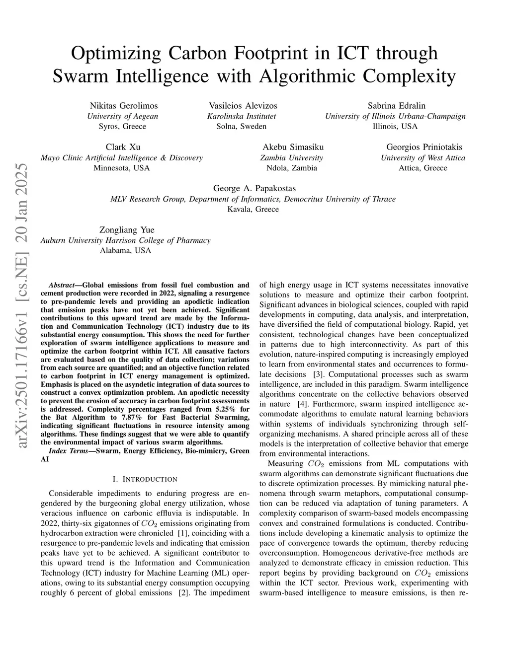 Global emissions from fossil fuel combustion and cement production were recorded in 2022, signaling a resurgence to pre-pandemic levels and providing an apodictic indication that emission peaks have not yet been achieved. Significant contributions to this upward trend are made by the Information and Communication Technology (ICT) industry due to its substantial energy consumption. This shows the need for further exploration of swarm intelligence applications to measure and optimize the carbon footprint within ICT. All causative factors are evaluated based on the quality of data collection; variations from each source are quantified; and an objective function related to carbon footprint in ICT energy management is optimized. Emphasis is placed on the asyndetic integration of data sources to construct a convex optimization problem. An apodictic necessity to prevent the erosion of accuracy in carbon footprint assessments is addressed. Complexity percentages ranged from 5.25% for the Bat Algorithm to 7.87% for Fast Bacterial Swarming, indicating significant fluctuations in resource intensity among algorithms. These findings suggest that we were able to quantify the environmental impact of various swarm algorithms.