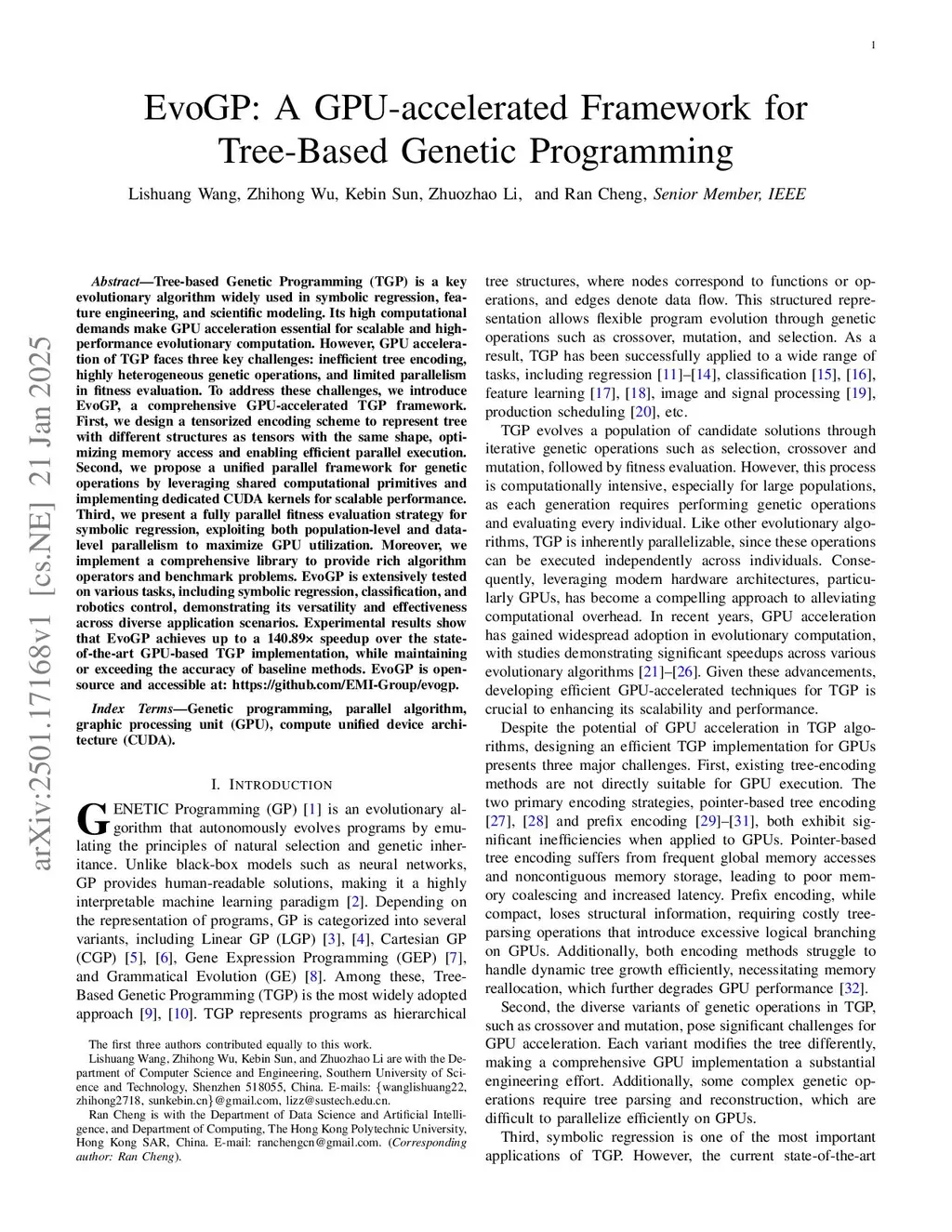 Tree-based Genetic Programming (TGP) is a widely used evolutionary algorithm for tasks such as symbolic regression, classification, and robotic control. Due to the intensive computational demands of running TGP, GPU acceleration is crucial for achieving scalable performance. However, efficient GPU-based execution of TGP remains challenging, primarily due to three core issues: (1) the structural heterogeneity of program individuals, (2) the complexity of integrating multiple levels of parallelism, and (3) the incompatibility between high-performance CUDA execution and flexible Python-based environments. To address these issues, we propose EvoGP, a high-performance framework tailored for GPU acceleration of TGP via population-level parallel execution. First, EvoGP introduces a tensorized representation that encodes variable-sized trees into fixed-shape, memory-aligned arrays, enabling uniform memory access and parallel computation across diverse individuals. Second, EvoGP adopts an adaptive parallelism strategy that dynamically combines intra- and inter-individual parallelism based on dataset size, ensuring high GPU utilization across a broad spectrum of tasks. Third, EvoGP embeds custom CUDA kernels into the PyTorch runtime, achieving seamless integration with Python-based environments such as Gym, MuJoCo, Brax, and Genesis. Experiments show that EvoGP attains a peak throughput exceeding GPops/s, with speedups of up to over GPU-based TGP implementations and over the fastest CPU-based libraries, while maintaining comparable accuracy and improved scalability across large population sizes. EvoGP is open source and accessible at:this https URL.