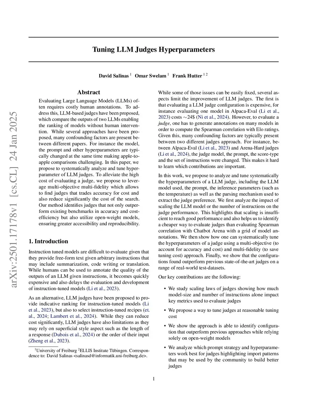 Evaluating Large Language Models (LLMs) often requires costly human annotations. To address this, LLM-based judges have been proposed, which compare the outputs of two LLMs enabling the ranking of models without human intervention. While several approaches have been proposed, many confounding factors are present between different papers. For instance the model, the prompt and other hyperparameters are typically changed at the same time making apple-to-apple comparisons challenging. In this paper, we propose to systematically analyze and tune the hyperparameters of LLM judges. To alleviate the high cost of evaluating a judge, we propose to leverage multi-objective multi-fidelity which allows to find judges that trade accuracy for cost and also significantly reduce the cost of the search. Our method identifies judges that not only outperform existing benchmarks in accuracy and cost-efficiency but also utilize open-weight models, ensuring greater accessibility and reproducibility. The code to reproduce our experiments is available at this repositorythis https URL.