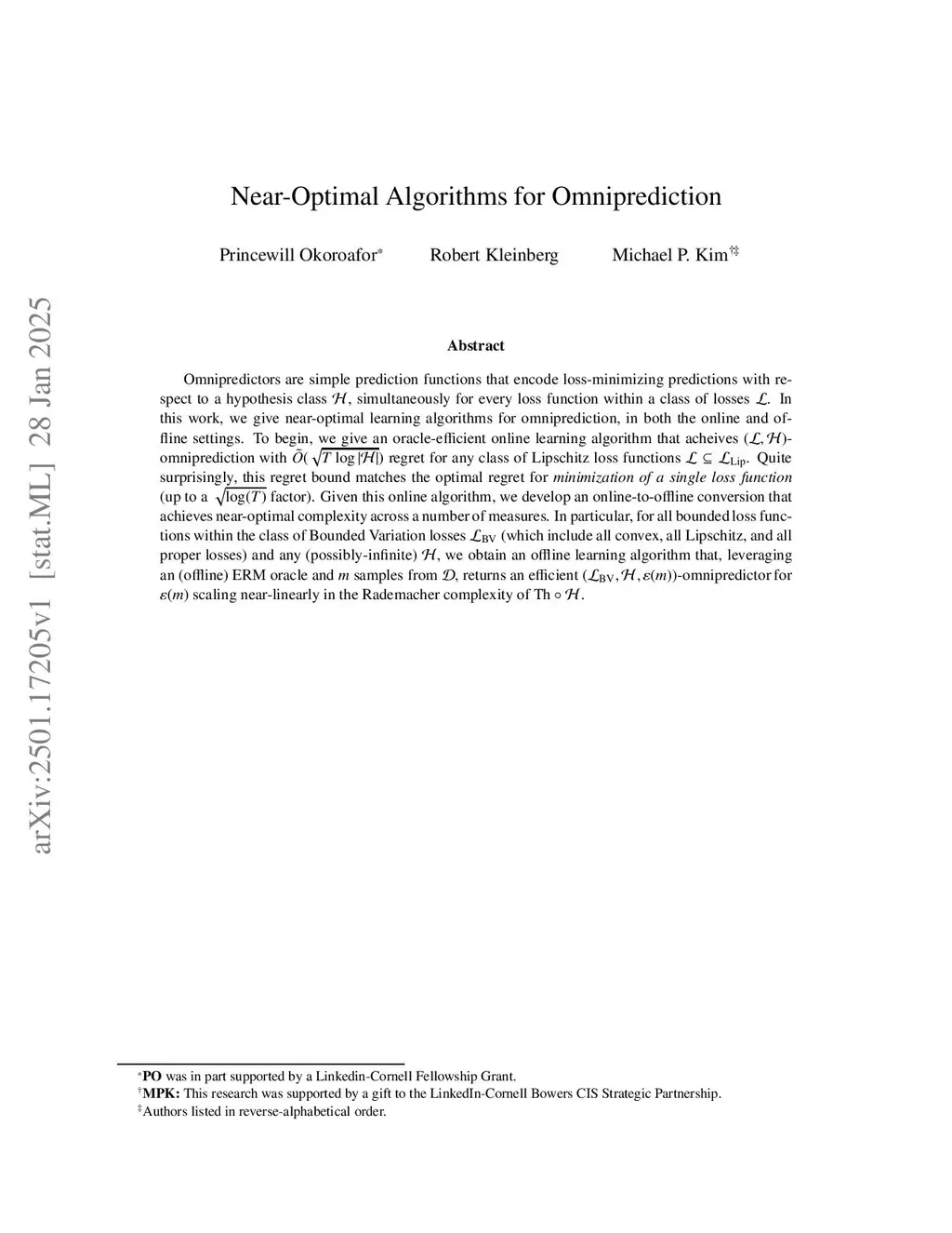 Omnipredictors are simple prediction functions that encode loss-minimizing predictions with respect to a hypothesis class , simultaneously for every loss function within a class of losses . In this work, we give near-optimal learning algorithms for omniprediction, in both the online and offline settings. To begin, we give an oracle-efficient online learning algorithm that acheives -omniprediction with regret for any class of Lipschitz loss functions . Quite surprisingly, this regret bound matches the optimal regret for \emph{minimization of a single loss function} (up to a factor). Given this online algorithm, we develop an online-to-offline conversion that achieves near-optimal complexity across a number of measures. In particular, for all bounded loss functions within the class of Bounded Variation losses (which include all convex, all Lipschitz, and all proper losses) and any (possibly-infinite) , we obtain an offline learning algorithm that, leveraging an (offline) ERM oracle and samples from , returns an efficient -omnipredictor for scaling near-linearly in the Rademacher complexity of a class derived from by taking convex combinations of a fixed number of elements of .