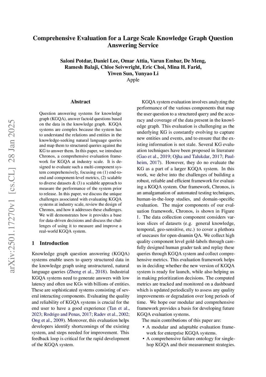 Question answering systems for knowledge graph (KGQA), answer factoid questions based on the data in the knowledge graph. KGQA systems are complex because the system has to understand the relations and entities in the knowledge-seeking natural language queries and map them to structured queries against the KG to answer them. In this paper, we introduce Chronos, a comprehensive evaluation framework for KGQA at industry scale. It is designed to evaluate such a multi-component system comprehensively, focusing on (1) end-to-end and component-level metrics, (2) scalable to diverse datasets and (3) a scalable approach to measure the performance of the system prior to release. In this paper, we discuss the unique challenges associated with evaluating KGQA systems at industry scale, review the design of Chronos, and how it addresses these challenges. We will demonstrate how it provides a base for data-driven decisions and discuss the challenges of using it to measure and improve a real-world KGQA system.