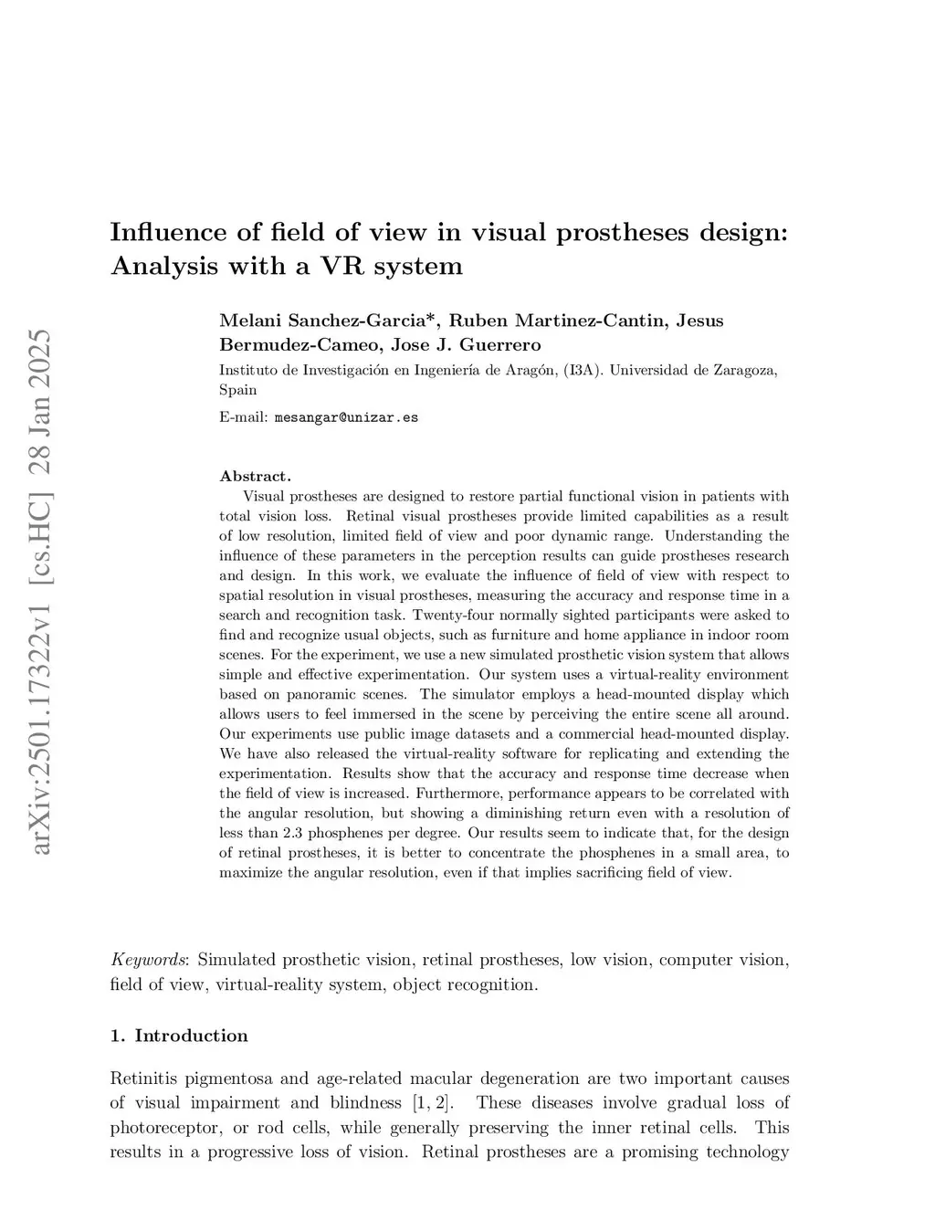 Influence of field of view in visual prostheses design: Analysis with a VR system