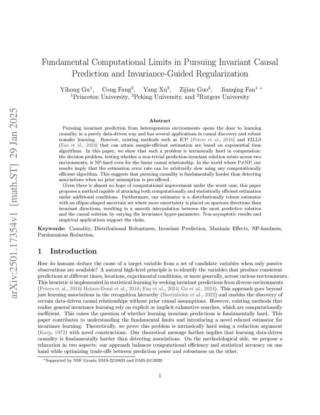 Pursuing invariant prediction from heterogeneous environments opens the door to learning causality in a purely data-driven way and has several applications in causal discovery and robust transfer learning. However, existing methods such as ICP [Peters et al., 2016] and EILLS [Fan et al., 2024] that can attain sample-efficient estimation are based on exponential time algorithms. In this paper, we show that such a problem is intrinsically hard in computation: the decision problem, testing whether a non-trivial prediction-invariant solution exists across two environments, is NP-hard even for the linear causal relationship. In the world where PNP, our results imply that the estimation error rate can be arbitrarily slow using any computationally efficient algorithm. This suggests that pursuing causality is fundamentally harder than detecting associations when no prior assumption is pre-offered.Given there is almost no hope of computational improvement under the worst case, this paper proposes a method capable of attaining both computationally and statistically efficient estimation under additional conditions. Furthermore, our estimator is a distributionally robust estimator with an ellipse-shaped uncertain set where more uncertainty is placed on spurious directions than invariant directions, resulting in a smooth interpolation between the most predictive solution and the causal solution by varying the invariance hyper-parameter. Non-asymptotic results and empirical applications support the claim.