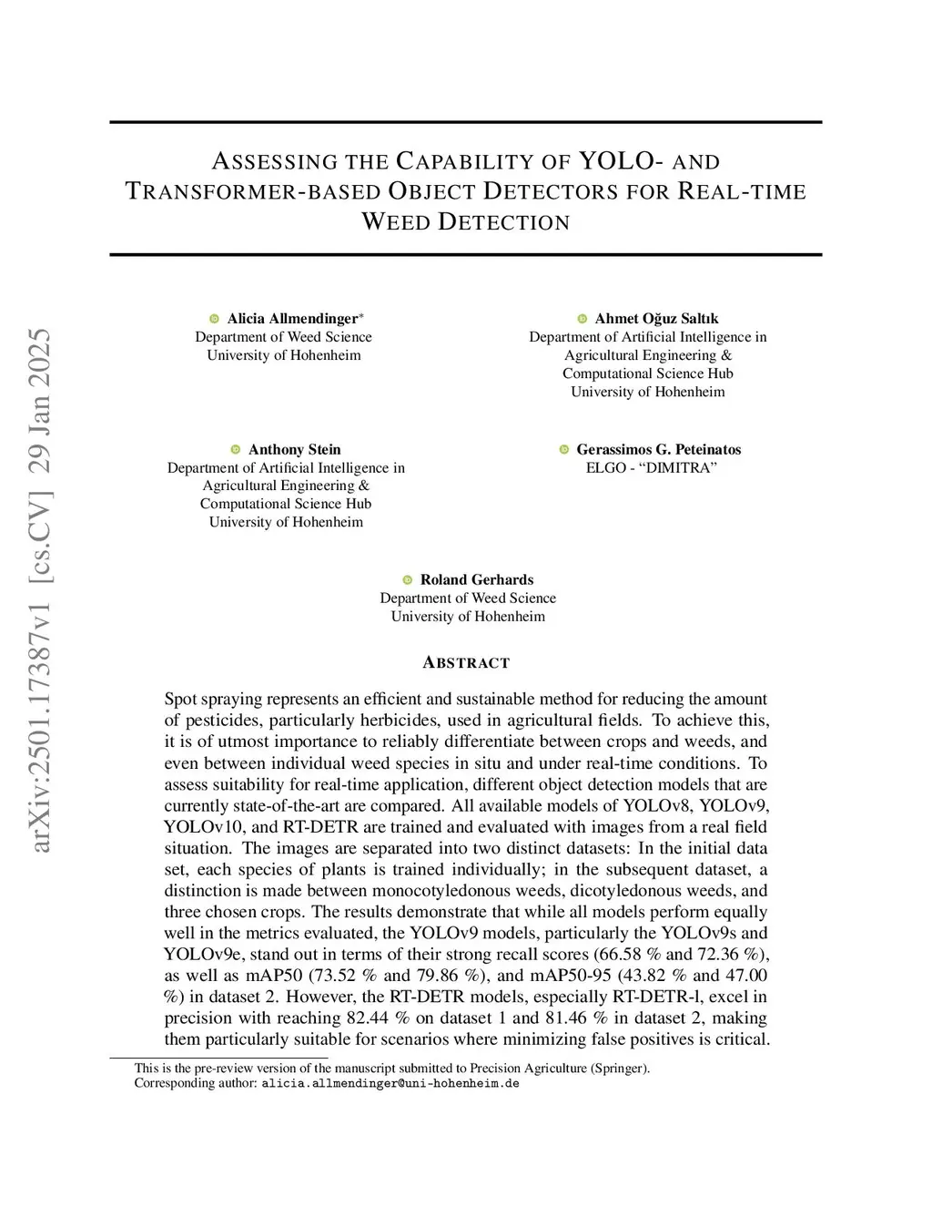 Spot spraying represents an efficient and sustainable method for reducing the amount of pesticides, particularly herbicides, used in agricultural fields. To achieve this, it is of utmost importance to reliably differentiate between crops and weeds, and even between individual weed species in situ and under real-time conditions. To assess suitability for real-time application, different object detection models that are currently state-of-the-art are compared. All available models of YOLOv8, YOLOv9, YOLOv10, and RT-DETR are trained and evaluated with images from a real field situation. The images are separated into two distinct datasets: In the initial data set, each species of plants is trained individually; in the subsequent dataset, a distinction is made between monocotyledonous weeds, dicotyledonous weeds, and three chosen crops. The results demonstrate that while all models perform equally well in the metrics evaluated, the YOLOv9 models, particularly the YOLOv9s and YOLOv9e, stand out in terms of their strong recall scores (66.58 % and 72.36 %), as well as mAP50 (73.52 % and 79.86 %), and mAP50-95 (43.82 % and 47.00 %) in dataset 2. However, the RT-DETR models, especially RT-DETR-l, excel in precision with reaching 82.44 \% on dataset 1 and 81.46 % in dataset 2, making them particularly suitable for scenarios where minimizing false positives is critical. In particular, the smallest variants of the YOLO models (YOLOv8n, YOLOv9t, and YOLOv10n) achieve substantially faster inference times down to 7.58 ms for dataset 2 on the NVIDIA GeForce RTX 4090 GPU for analyzing one frame, while maintaining competitive accuracy, highlighting their potential for deployment in resource-constrained embedded computing devices as typically used in productive setups.